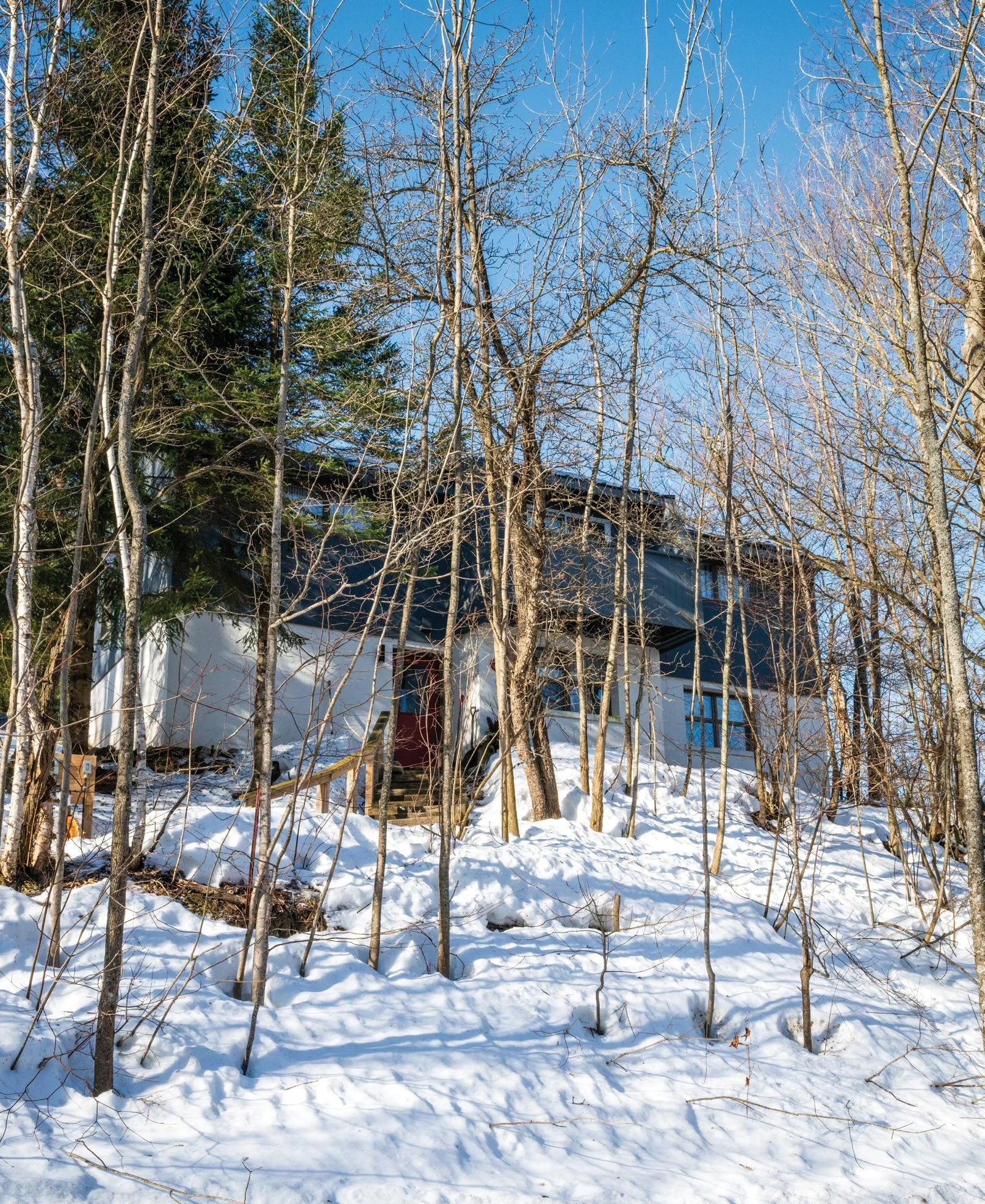 The couple reached out to Tricia after seeing her work on a nearby home. She knows Devil’s Glen well. More than 20 years ago, she redesigned the clubhouse and has shaped many chalets tucked into the escarpment. “I’ve been blessed. I’ve built long relationships here,” she says. Those relationships extend to her trades. Dovetail’s team handles design and contracting in-house, working directly with partners they trust. On this chalet, the exterior envelope came first: a new roof system, upgraded windows and solid doors supplied by AM Group Exteriors to withstand mountain winters without compromising the view.