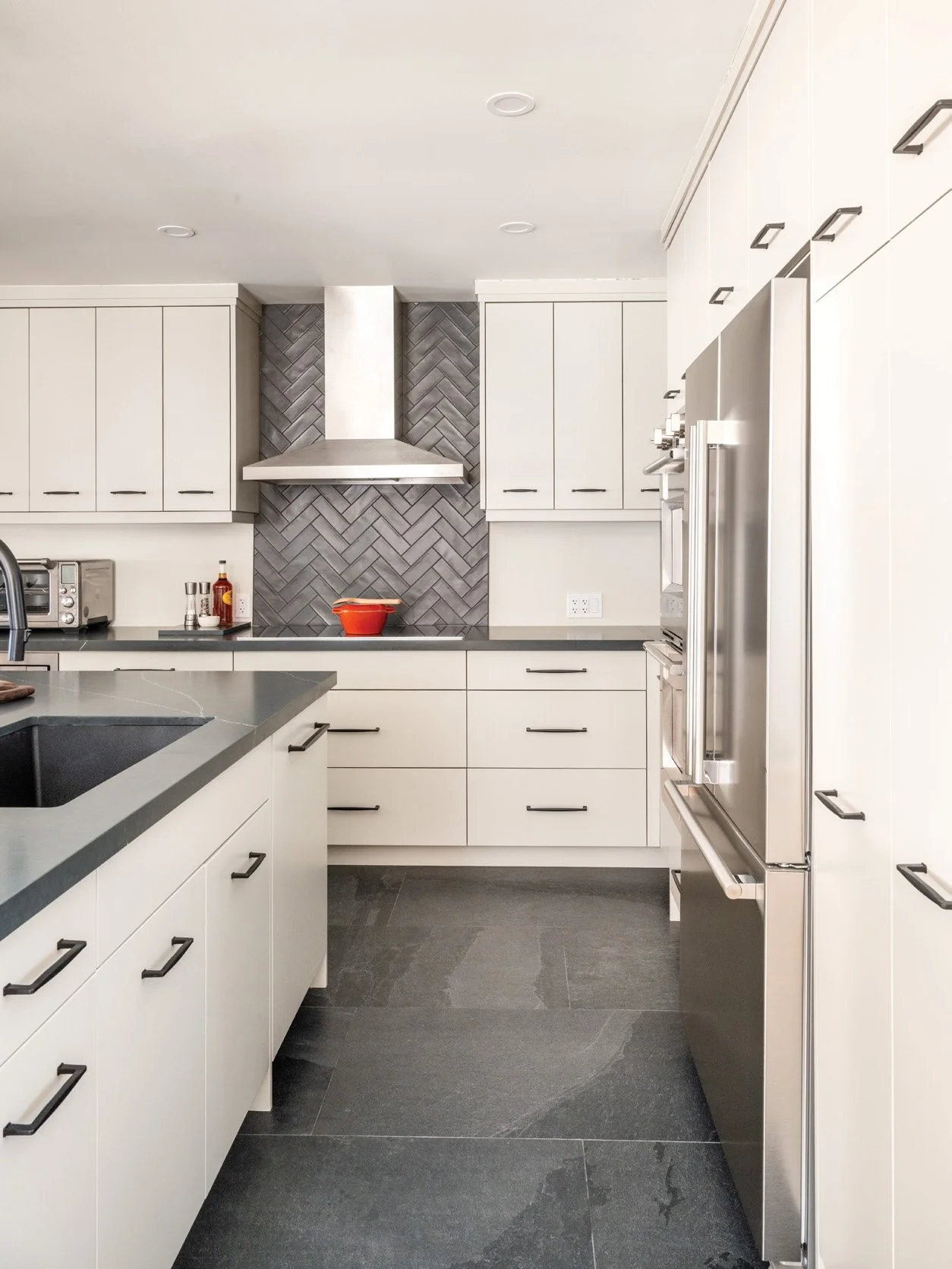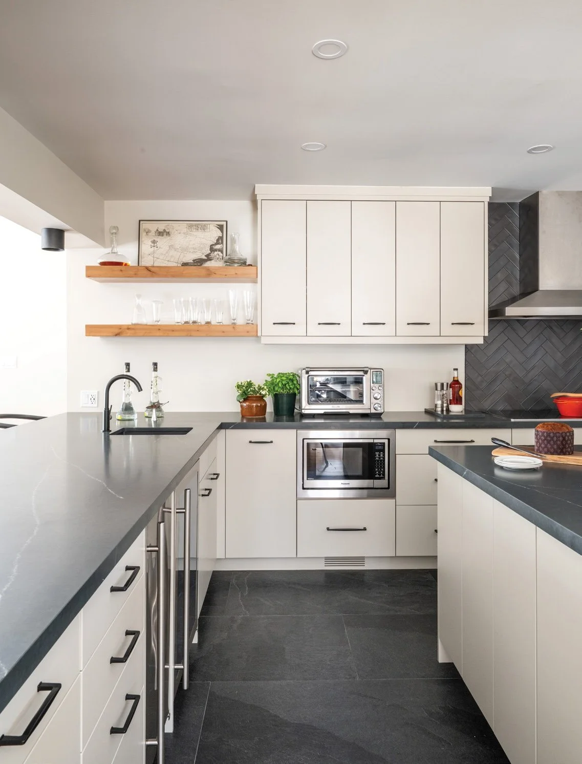 Above the island, a simple Kuzco light fixture sourced through Georgian Design Centre adds a playful tone. The hood wall, wrapped in herringbone tile from Deans Carpet One Floor & Home, brings texture without shouting. Tailored cabinetry with black hardware creates a crisp counterpoint to the timber beams overhead. Together, these details strike a balance of timeless materials, subtle texture and just enough whimsy to make the kitchen feel both welcoming and refined. The homeowners agree. “Our new kitchen is a joy to work in,” they say. “Tricia is a very talented designer with a great eye for what will work well.”