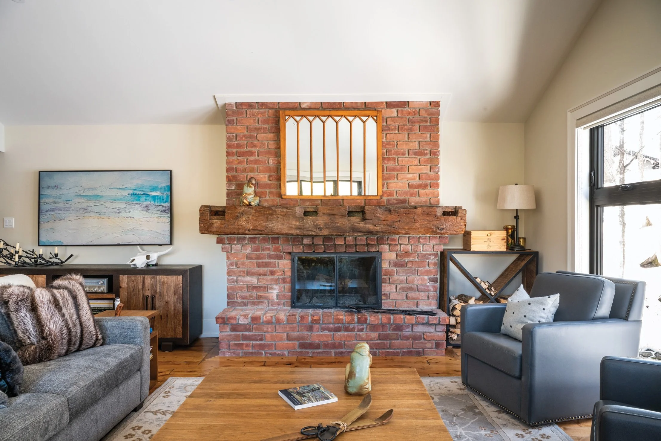 Tricia’s philosophy of leaning into the chalet’s character, rather than erasing it, extends throughout the home. In the living room, the original red brick fireplace remained, now framed by custom millwork for wood storage. “We were able to keep some of the features that we loved and work them into the new design,” the homeowners say.