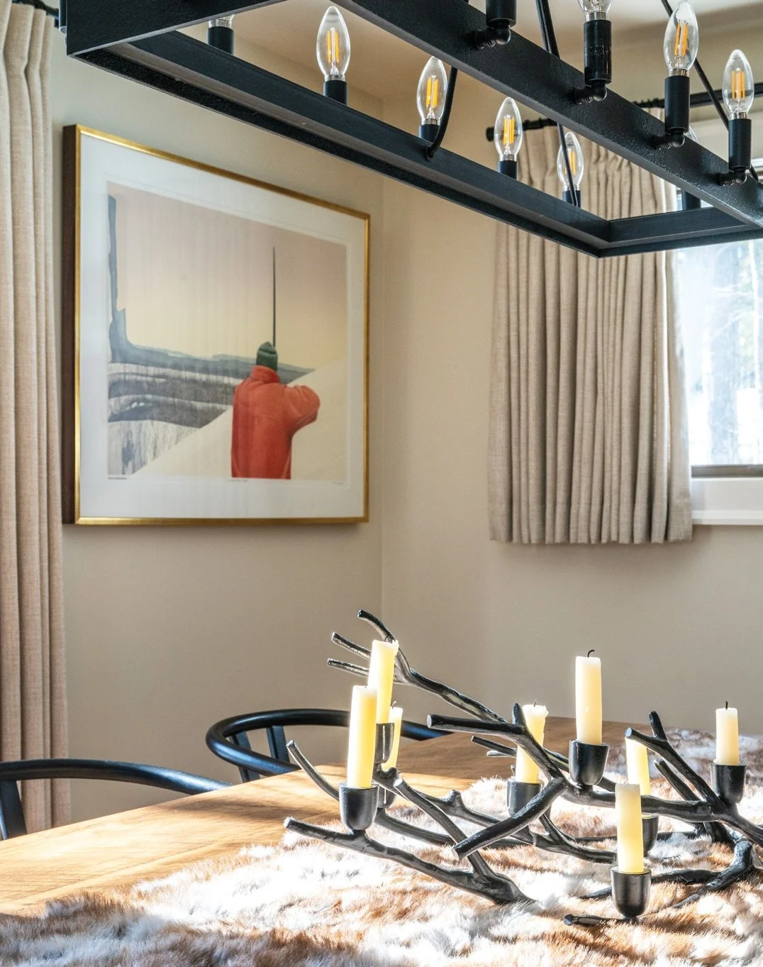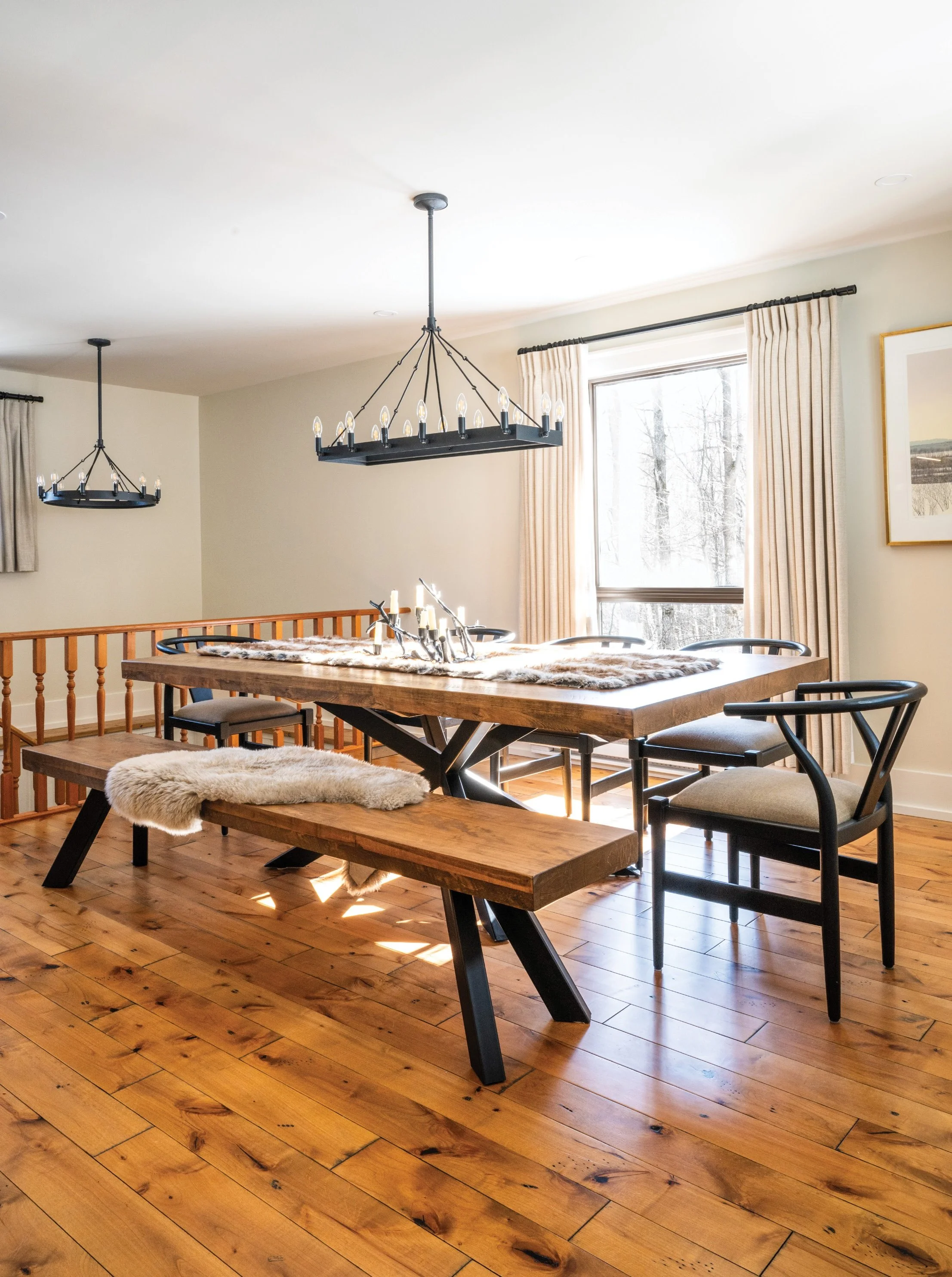 Gathering is truly what the space was designed for. A substantial plank-top dining table stretches the length of the room, supported by a sculptural iron trestle base built to hold a crowd. Above, the homeowners’ own iron chandeliers keep with the chalet’s modern yet rustic aesthetic.