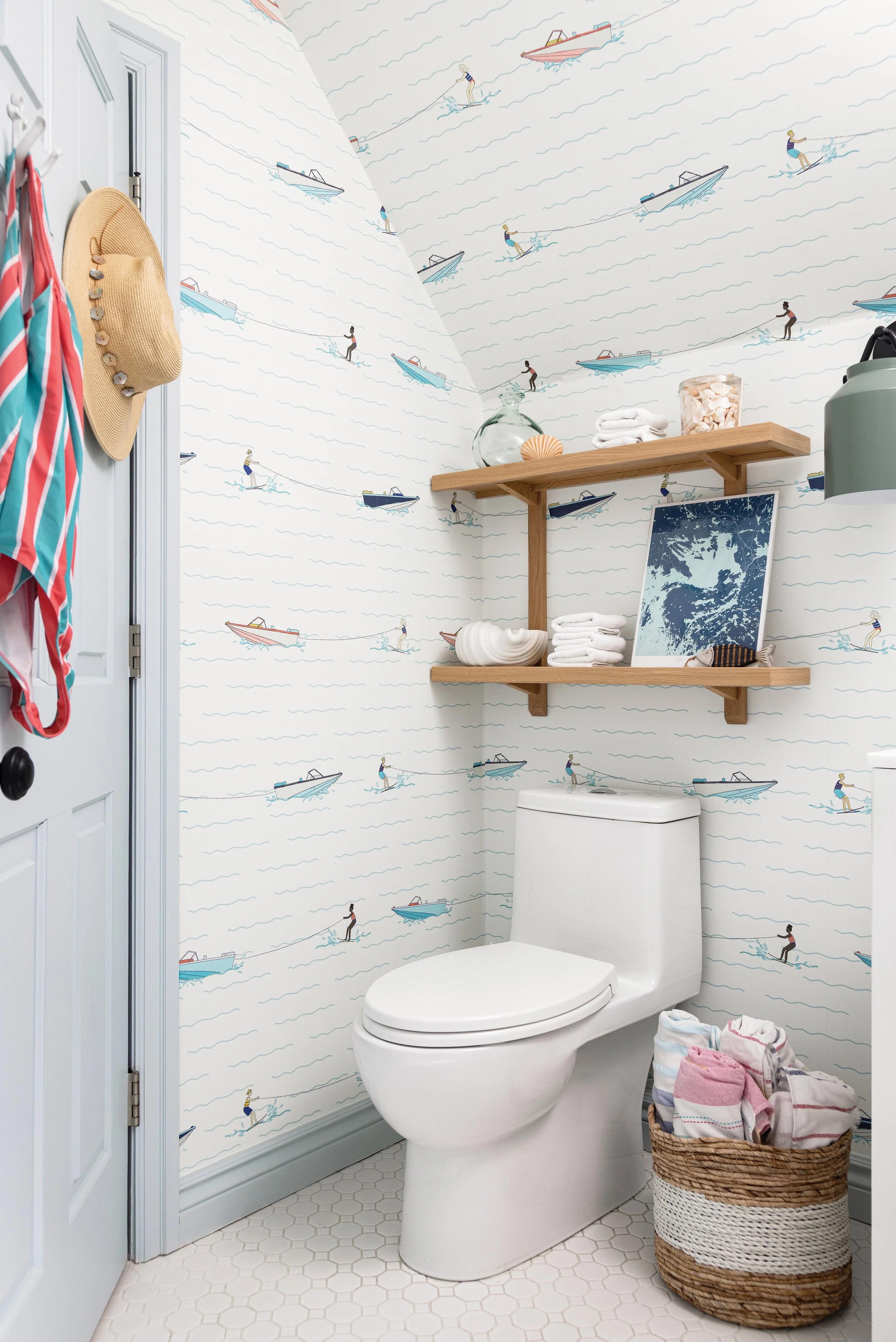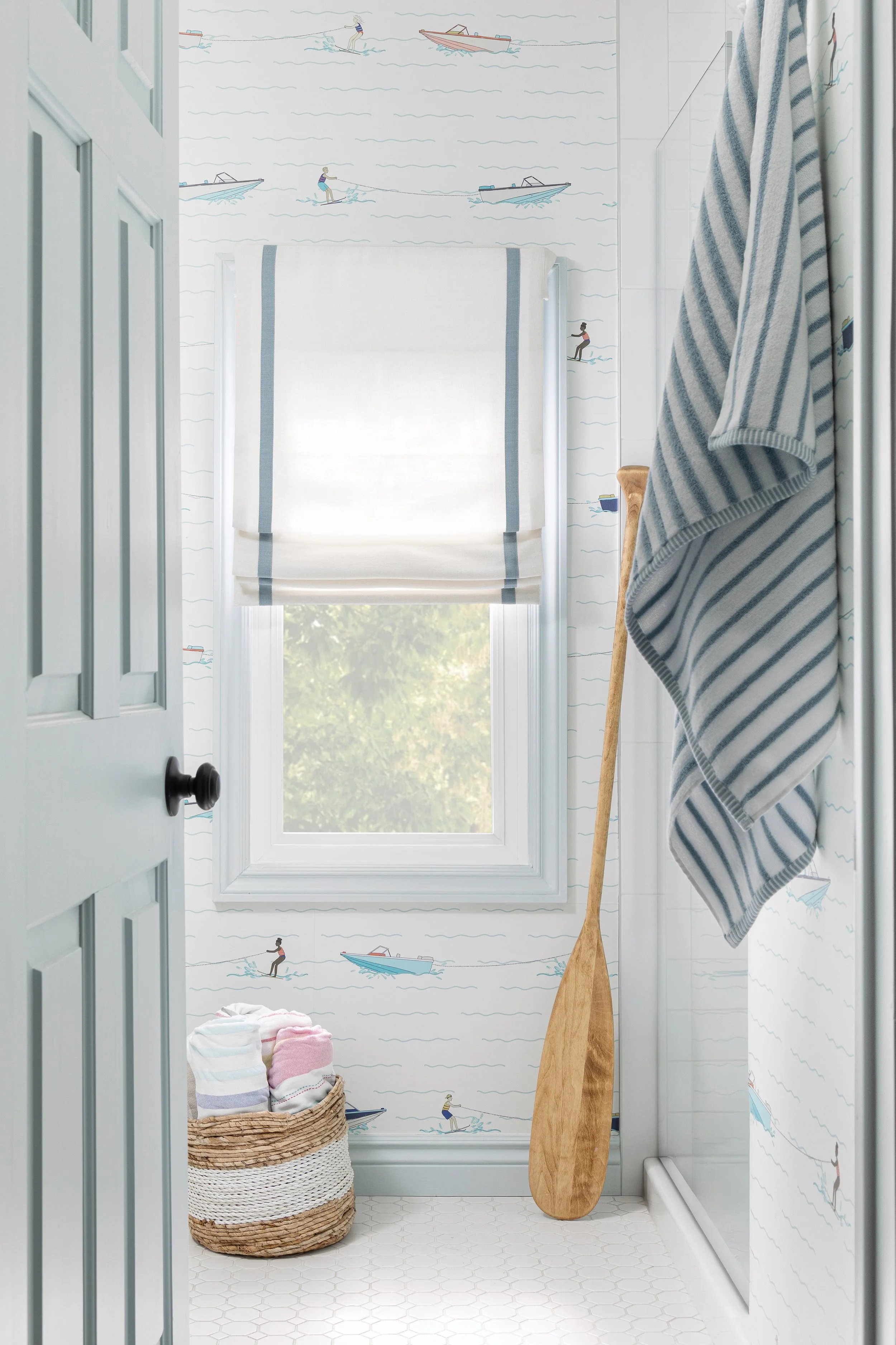 Playful details also help connect the home’s dual personality as both a summer and winter destination. Patterned wallpaper nods to outdoor adventures, while crisp blues and soft neutrals lean into the surrounding shoreline.