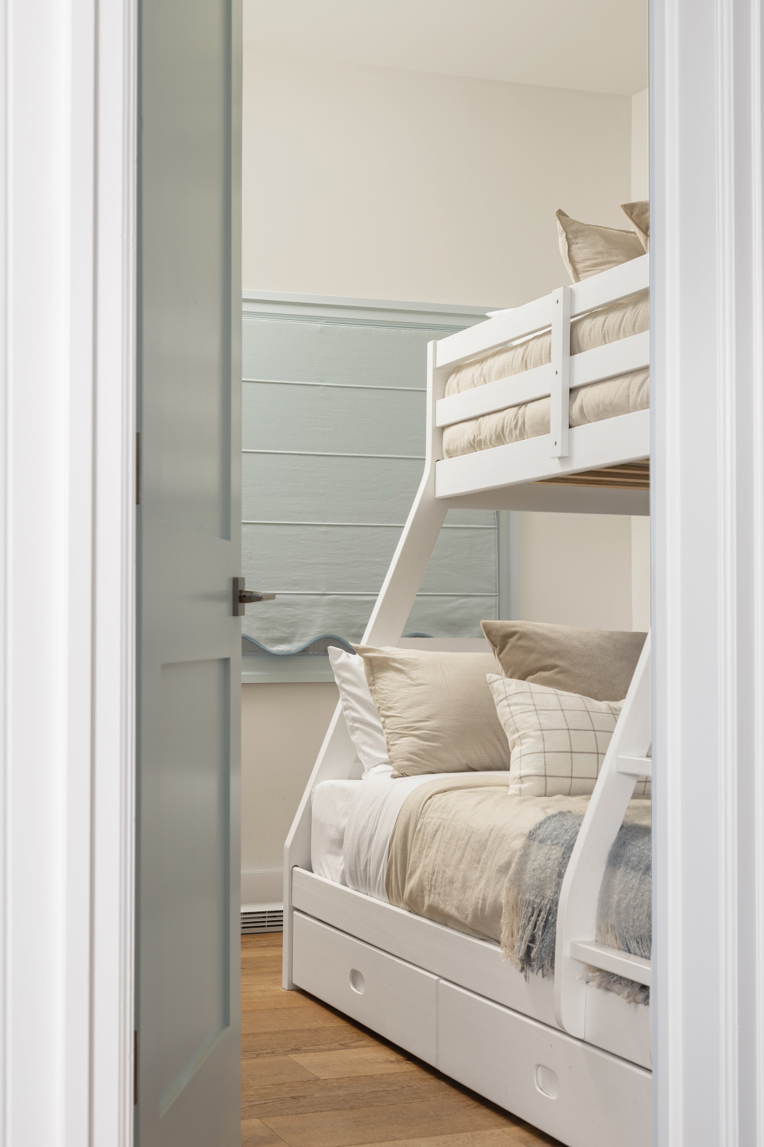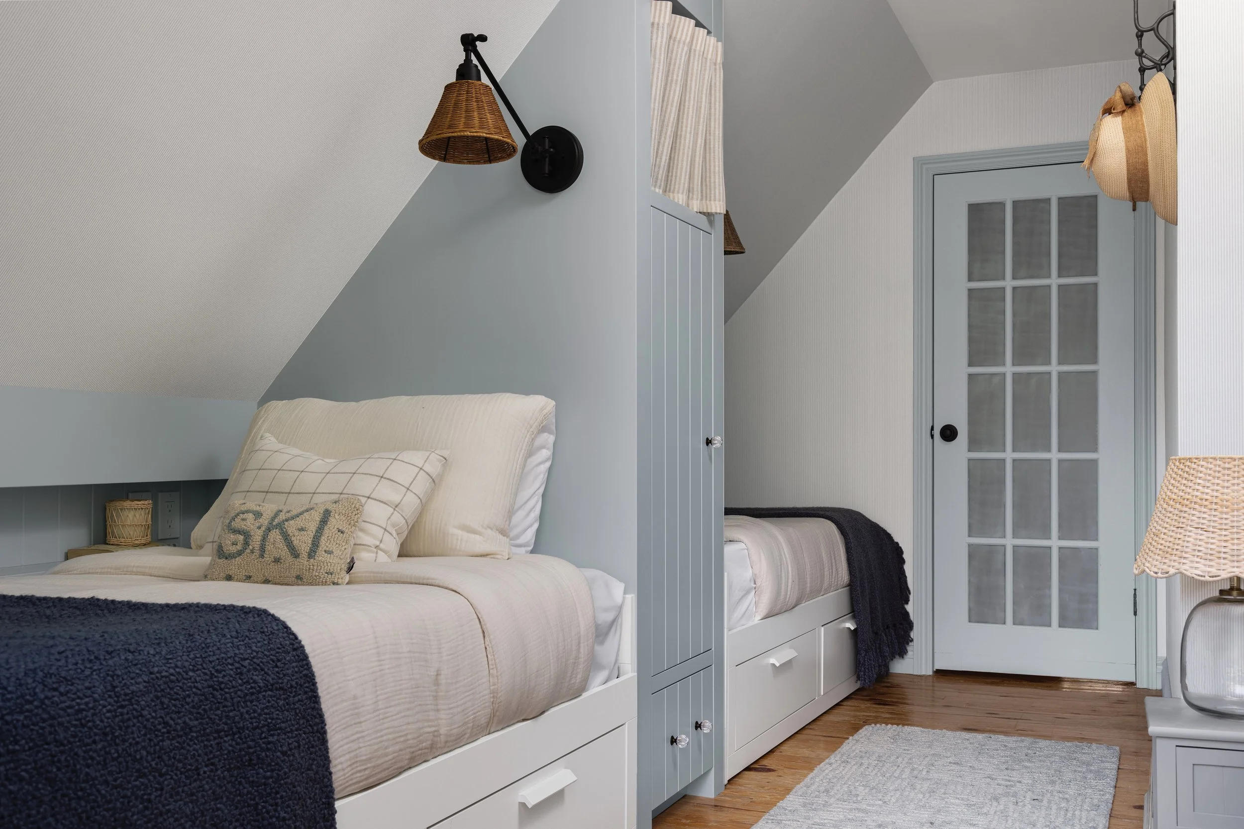In one particularly challenging area beneath the sloping roofline of the A-frame structure, the design team leaned into the architectural limitations and transformed the space into one of the home’s most delightful features. “The most difficult room in terms of space actually ended up becoming the cutest part of the house,” say the homeowners. “Tucking the beds into the low-ceiling area really utilized the space perfectly.”
