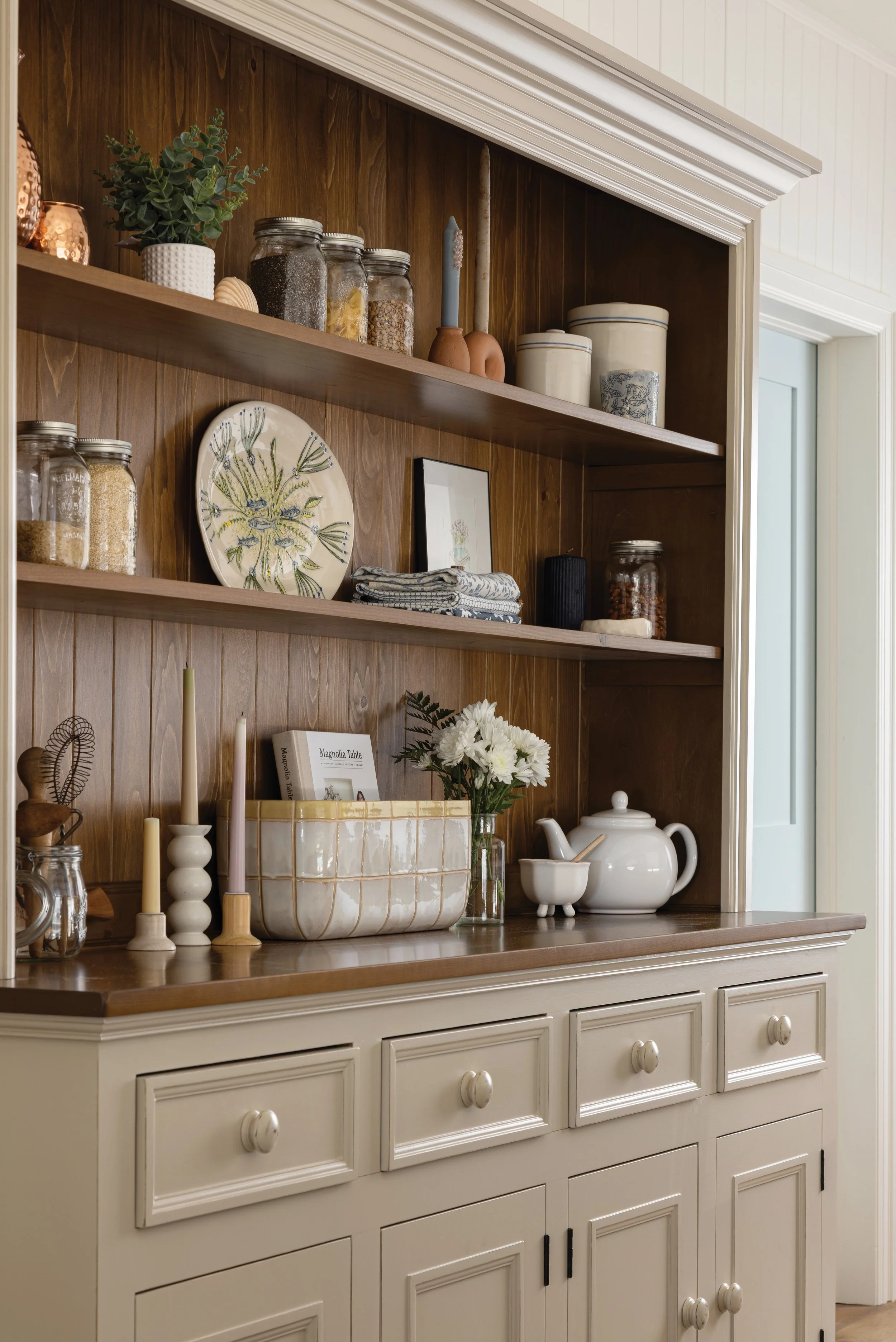 Custom millwork by Pride Kitchen & Bath became a defining feature, providing much needed storage while also adding visual interest throughout the cottage. Built-ins were added in key areas, including around the fireplace in the living room and bedrooms, maximizing storage without sacrificing charm.