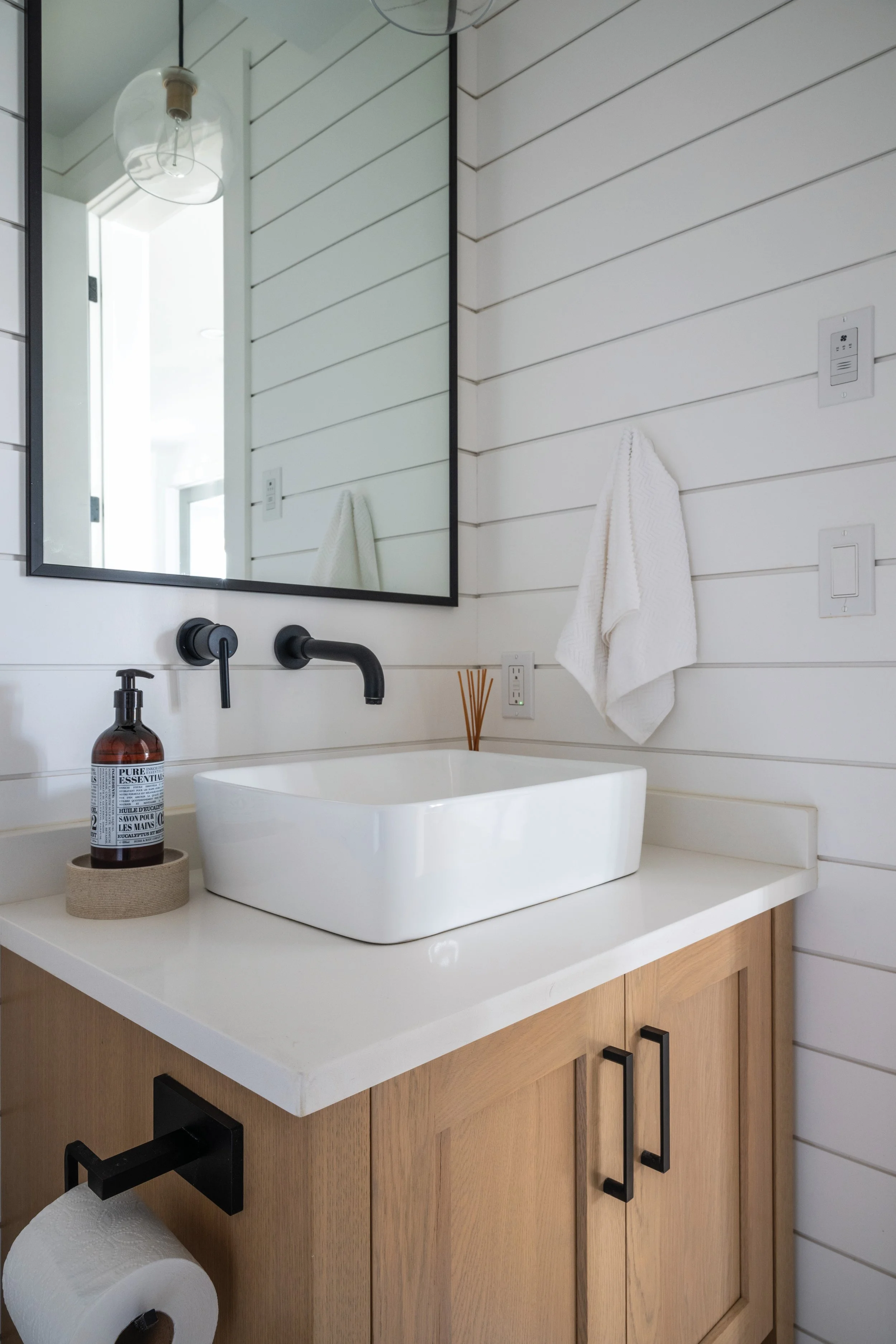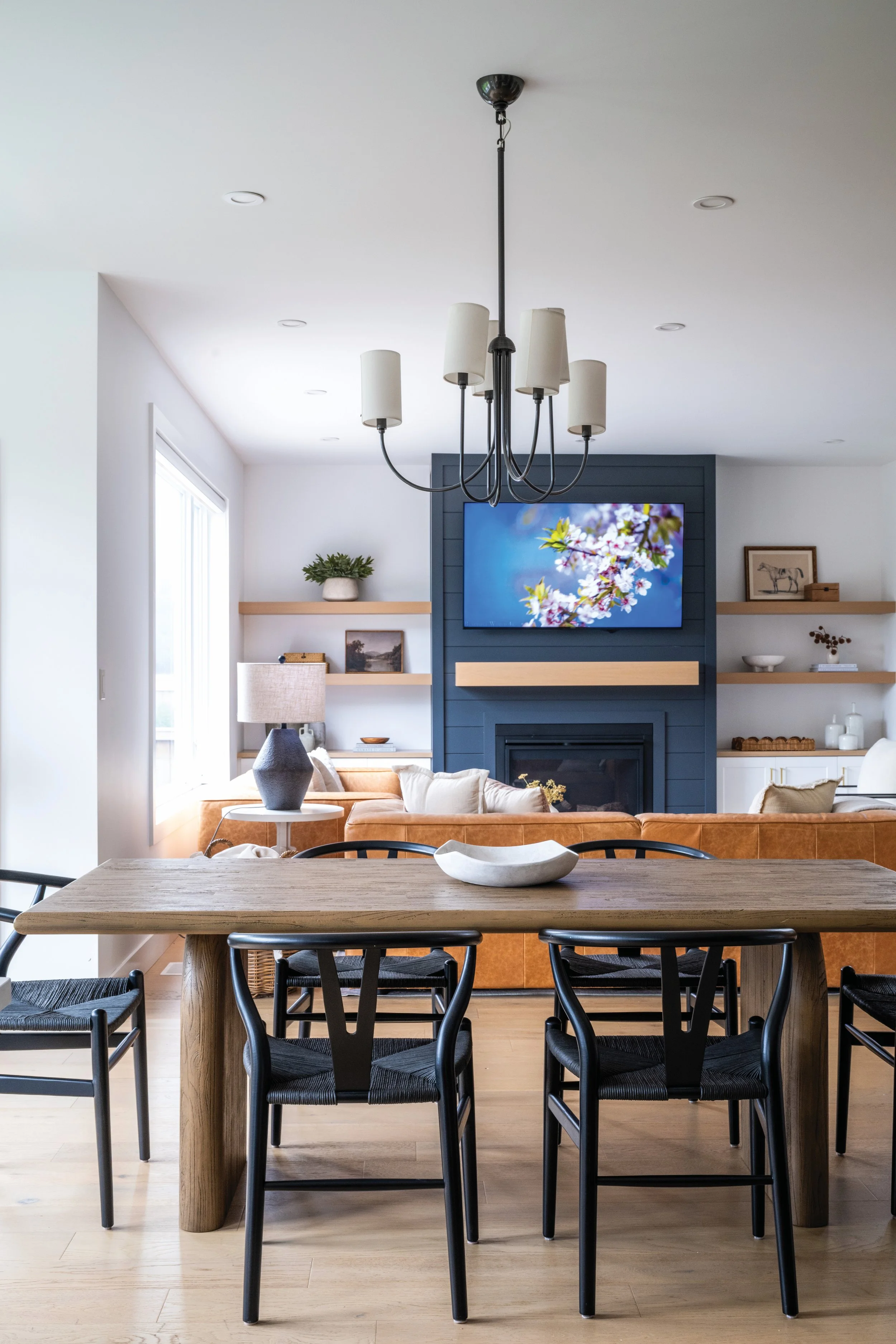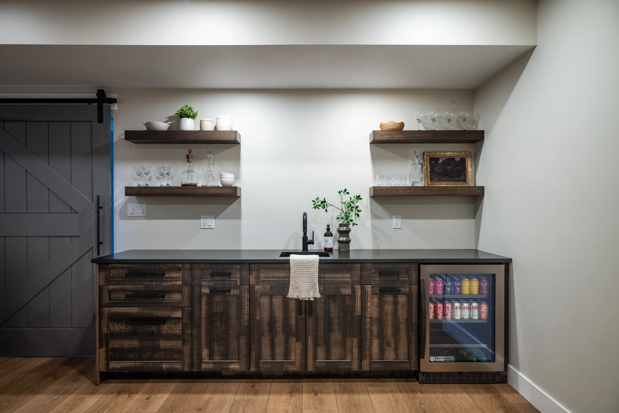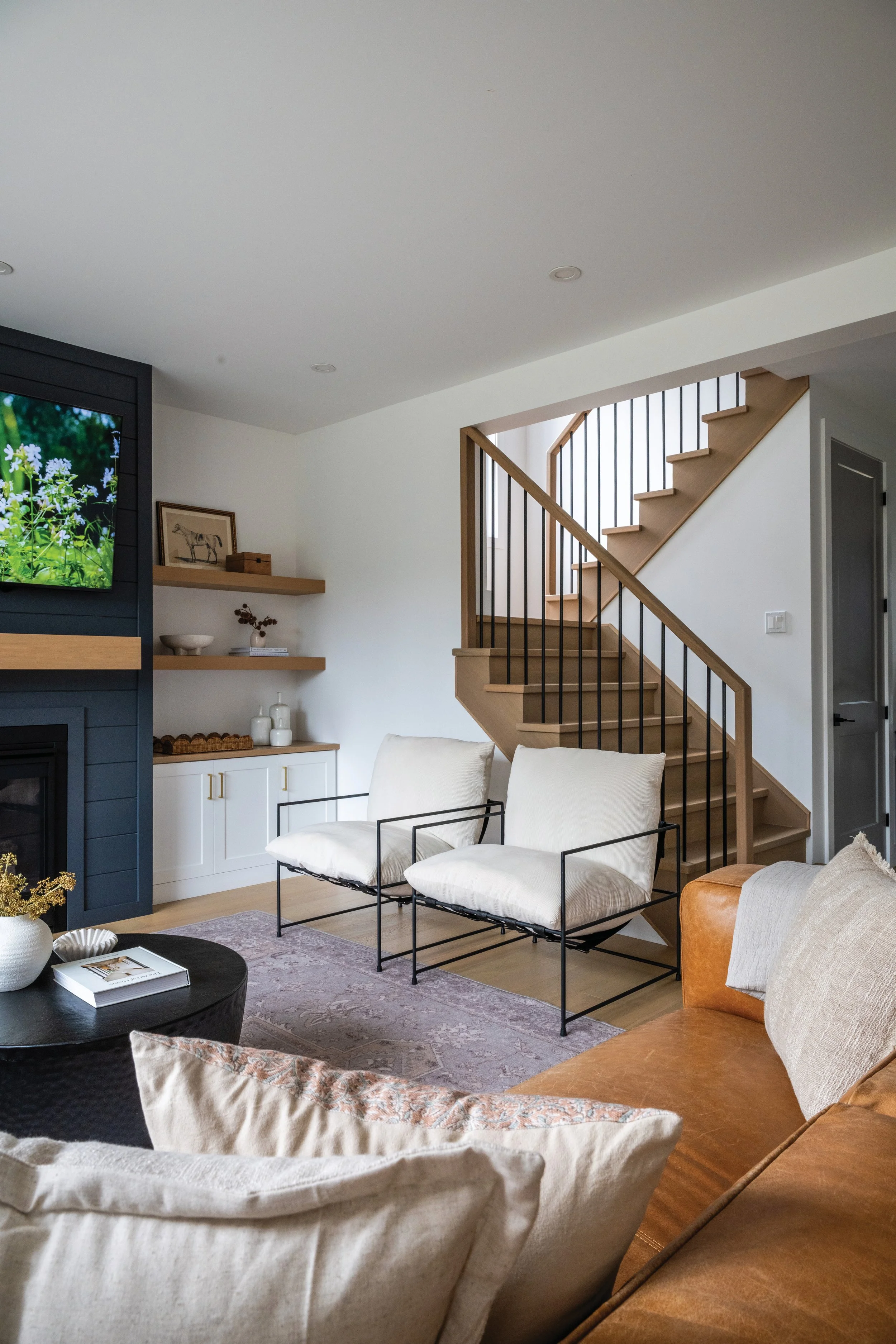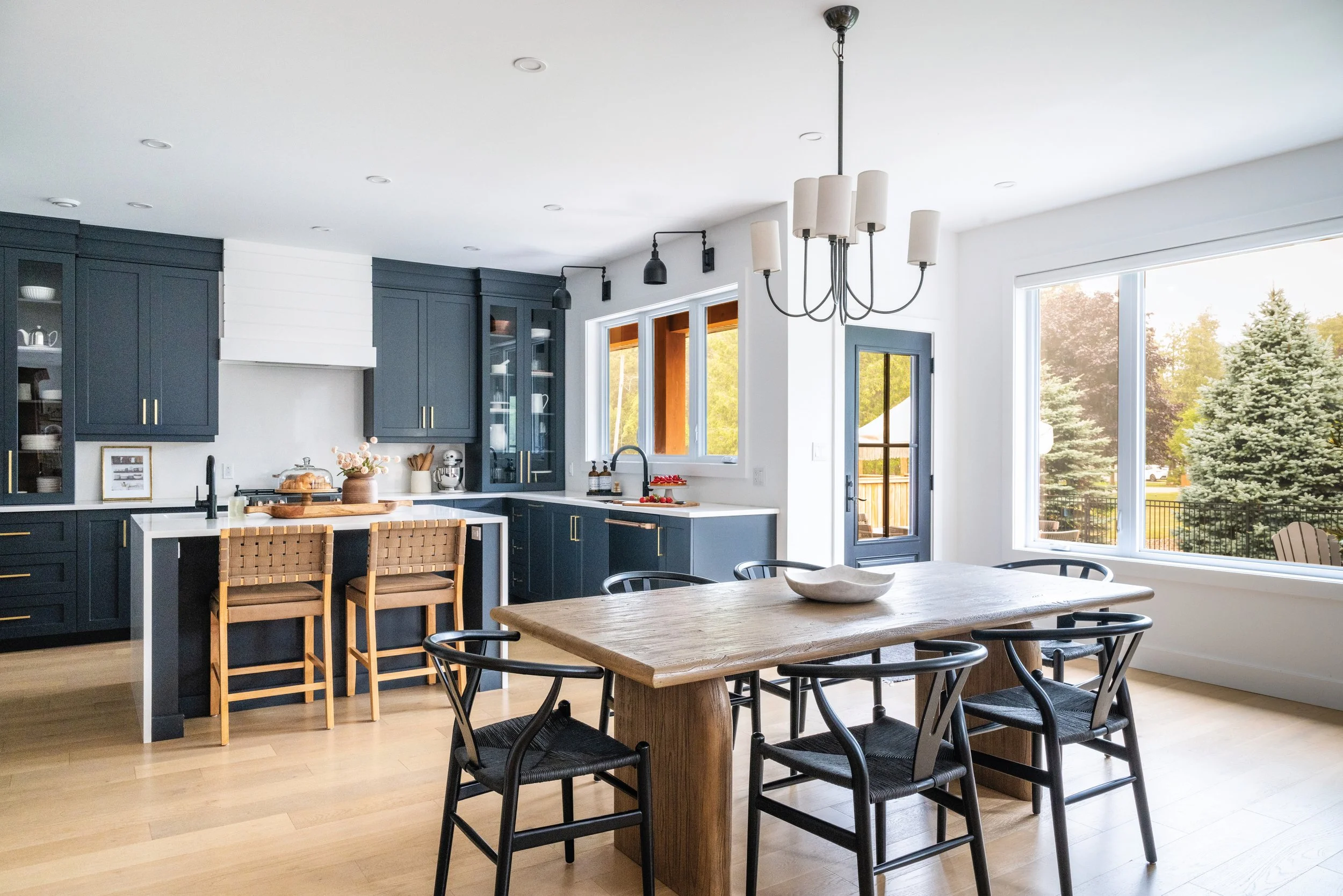 The family room centres on a gas fireplace with a sleek black shiplap surround, topped with a floating timber mantel and framed by built-in shelving. Engineered white oak flooring runs throughout the main living areas. Lockwood Painting completed the interior paint palette using Benjamin Moore paint to blend modern finishes with warmer, traditional elements. While Fairbro Electrical Services installed the electrical for the home.