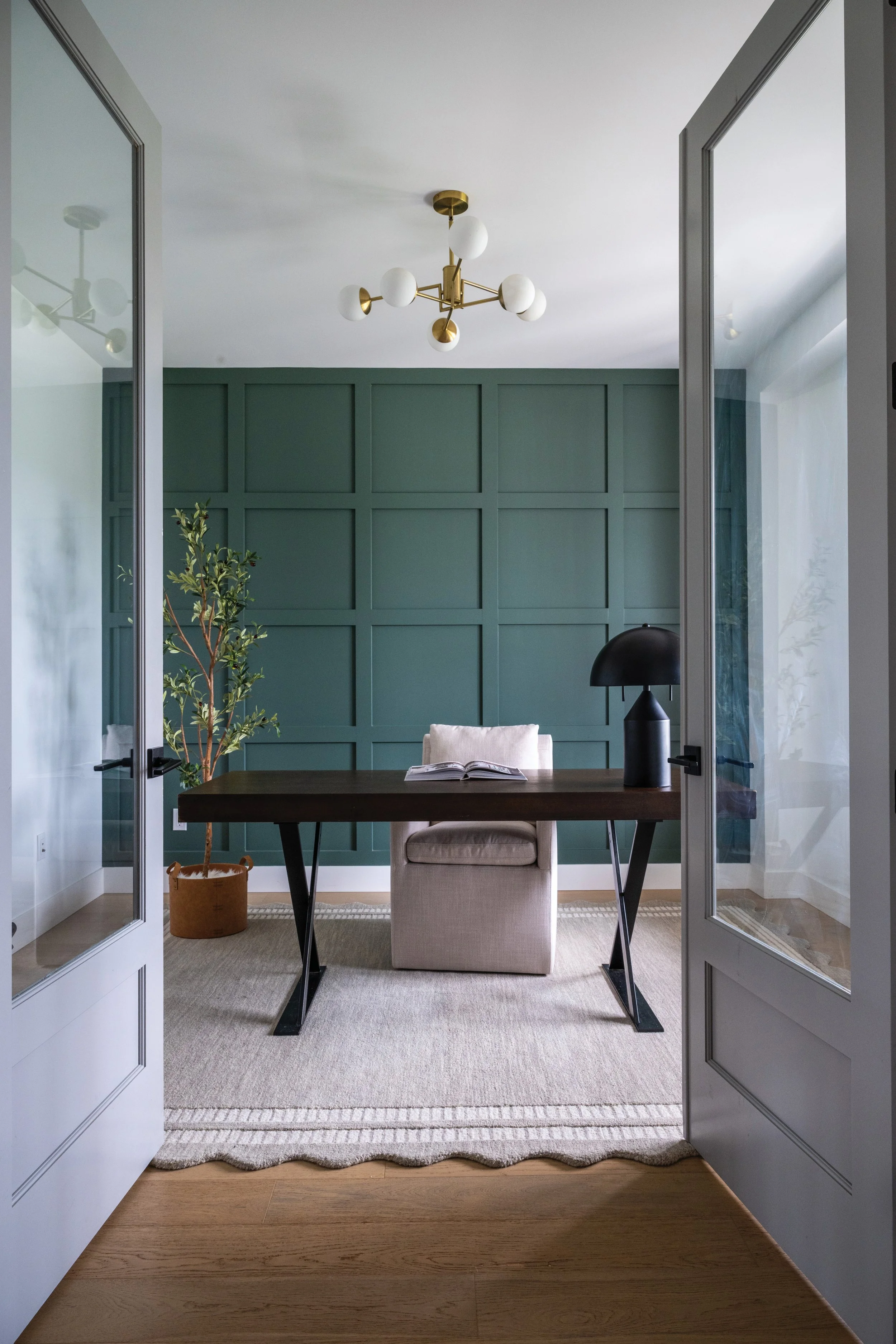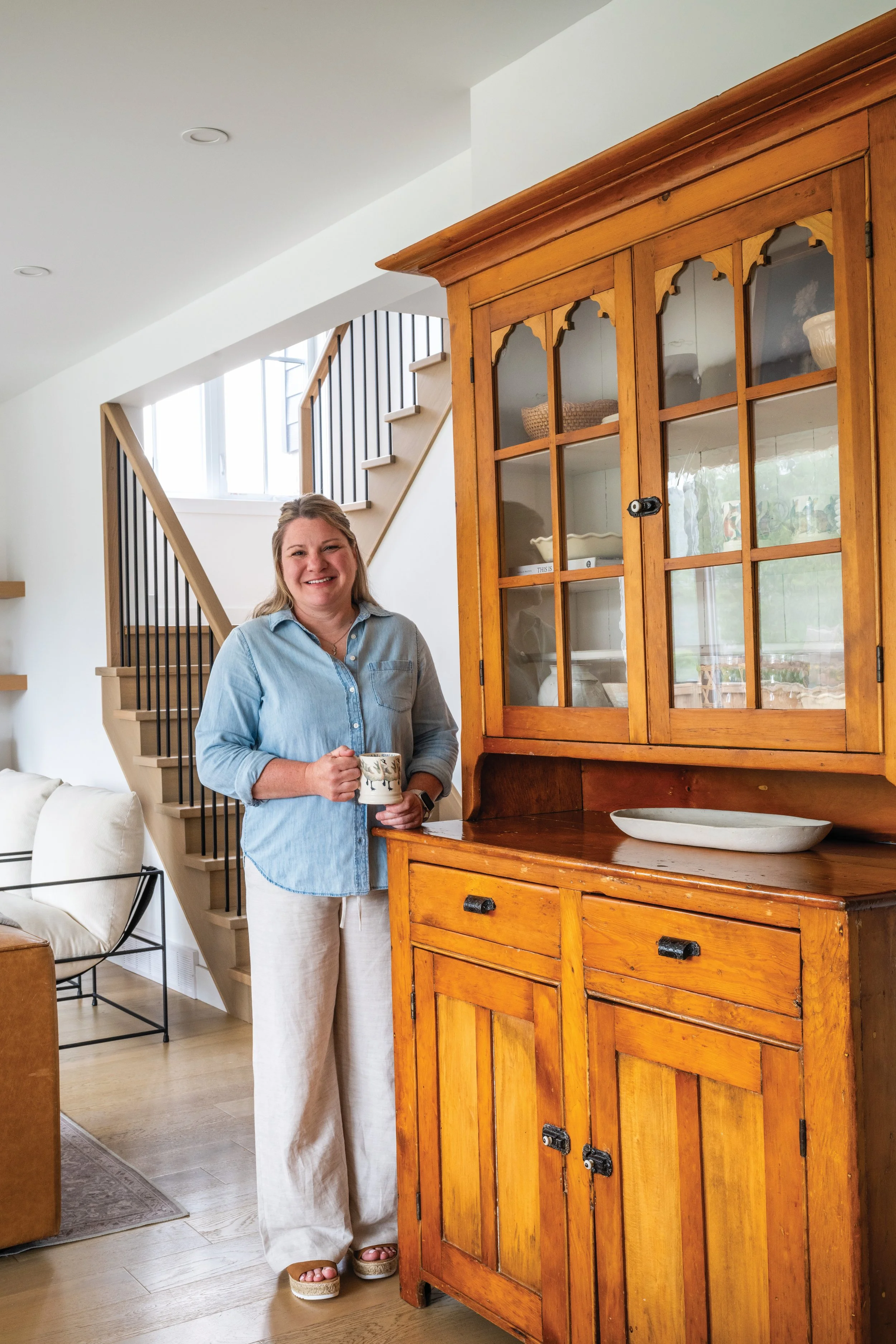 “I love the clean lines of the new build but like the softness of adding vintage pieces,” Angela says. “The combination of old with new creates my desired sense of an inviting and comfortable family home.” An antique wooden cabinet from her great-great-grandfather anchors part of the living space, while deeper accent tones throughout the home – such as the deep muted green Shaker-style wall in Paul’s office – add contrast to the otherwise neutral base.