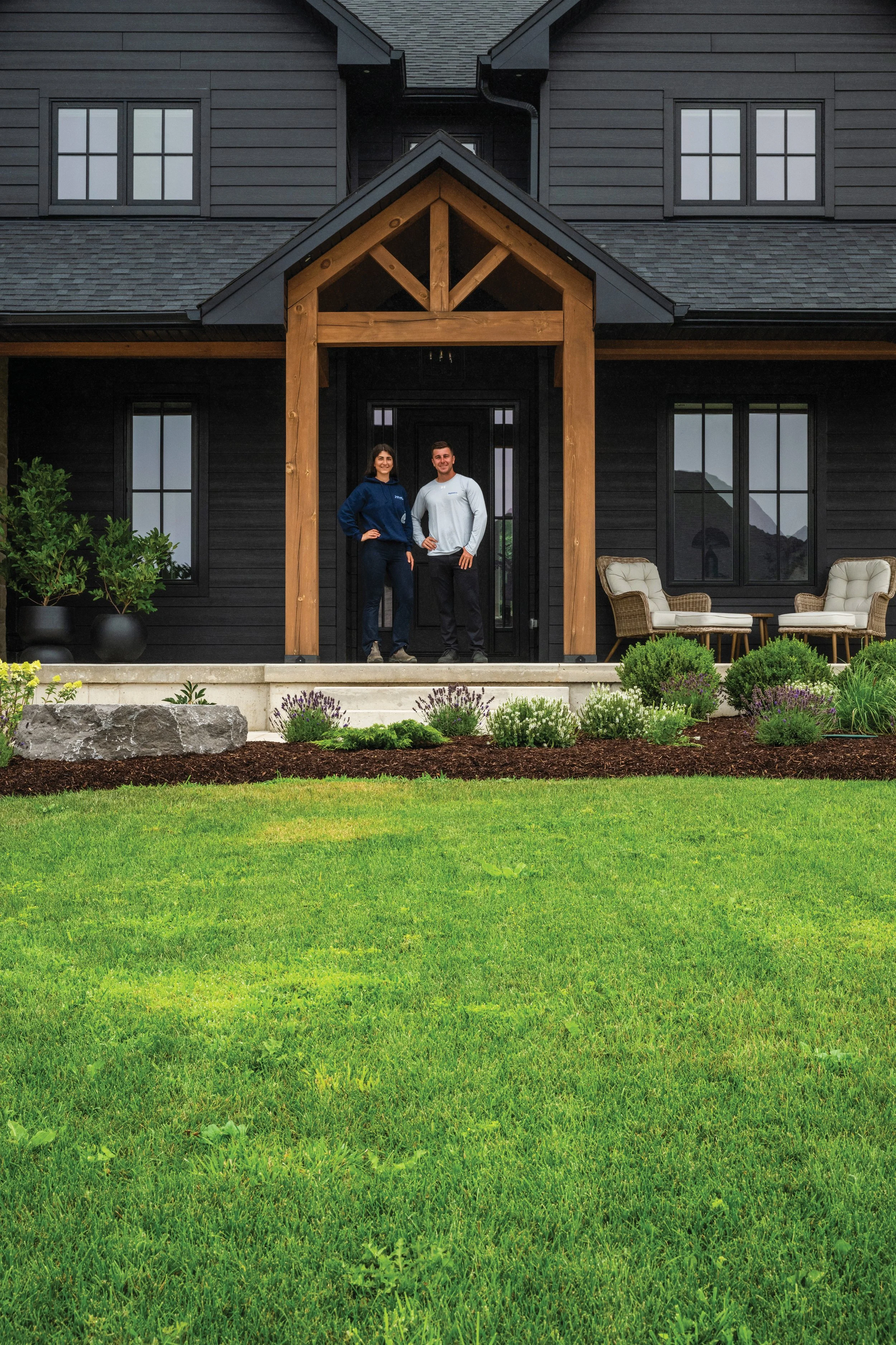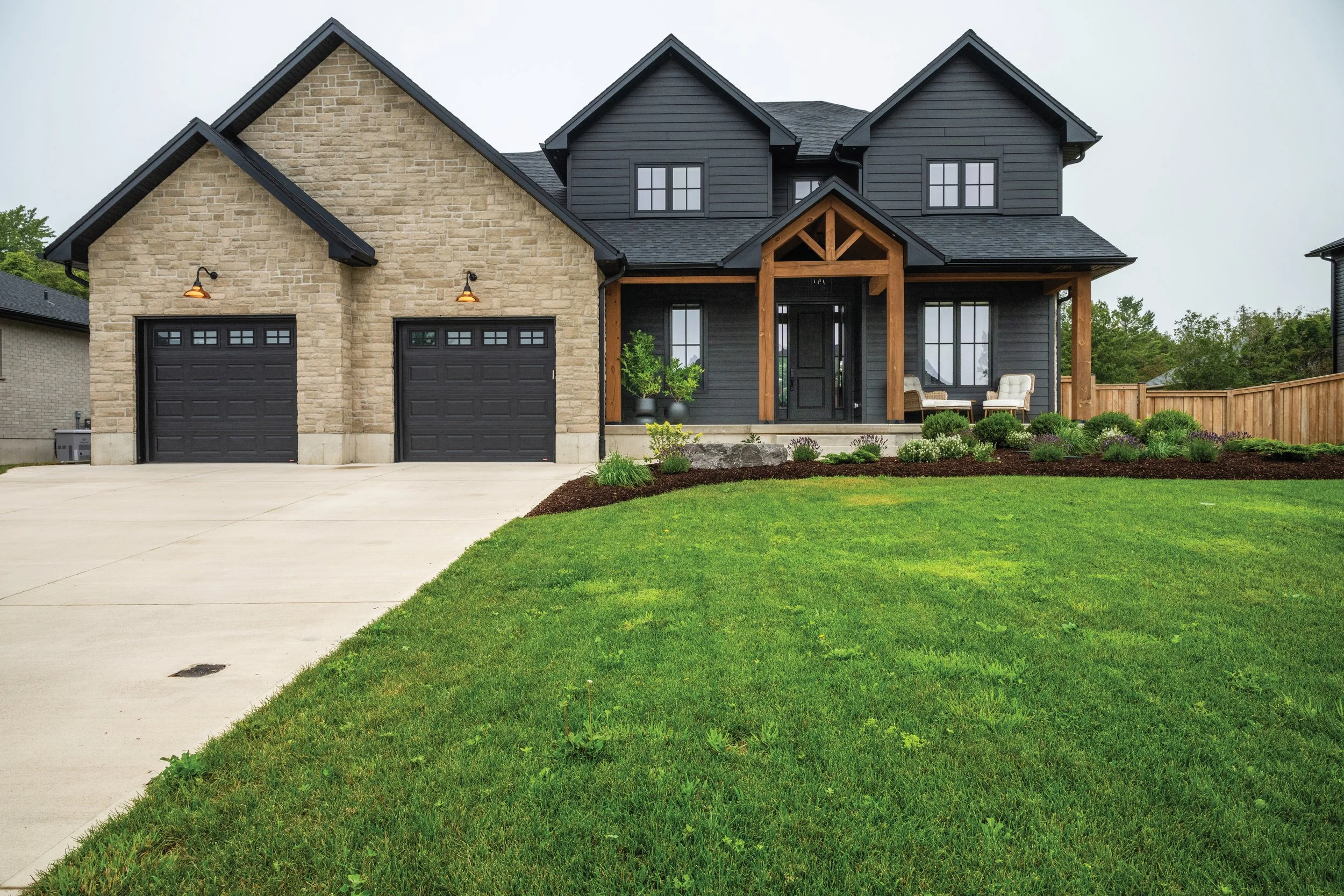 On the exterior, the home’s facade combines stone, from West Shore Stone & Brick Inc., midnight black HardiePlank Lap siding and warm custom-stained timbers, a look that aligns with the broader architectural tone Bogdanovic Homes cultivates across Crimson Oak Valley.