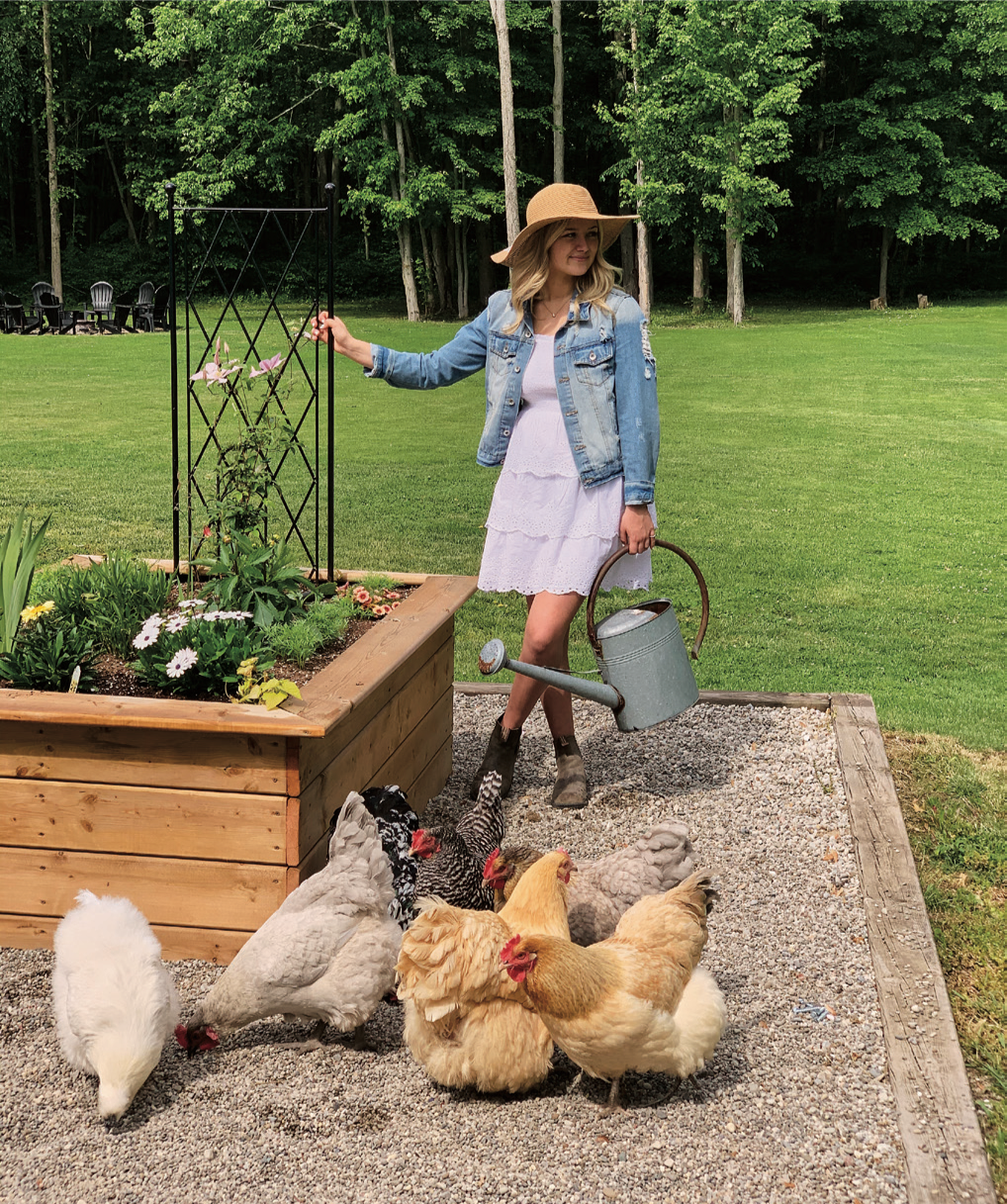 A matching pair of black-and-white chicken coops and a goat house border the property. They’re decked out with cupolas and custom stalls by carpenter Kale Rive from Limestone Trail. Across the field, an inground pool and pool house, outdoor firepit and raised garden beds create a dreamy outdoor oasis.