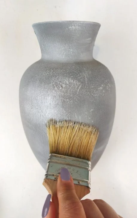 Dry-brush the lighter grey paint over the entire vase. To dry brush, dip your brush into a small amount of paint, wipe off excess onto the wax paper until most of the paint is gone. Holding the brush lightly, brush horizontally back and forth over the vase adding the light grey. Continue this step until the light grey has been applied over the whole vase.