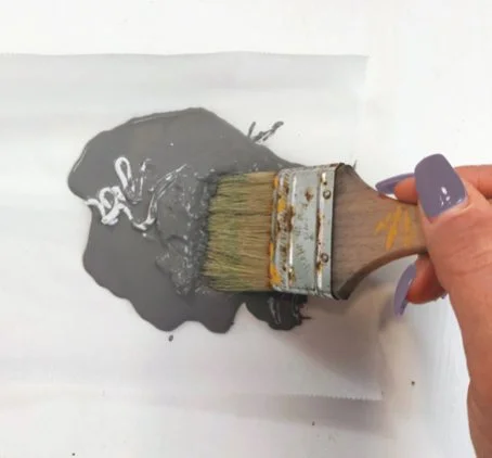 To create the concrete look, pour dark grey paint onto wax paper. Mix sand texture into the paint. This will add a gritty feel to your paint.