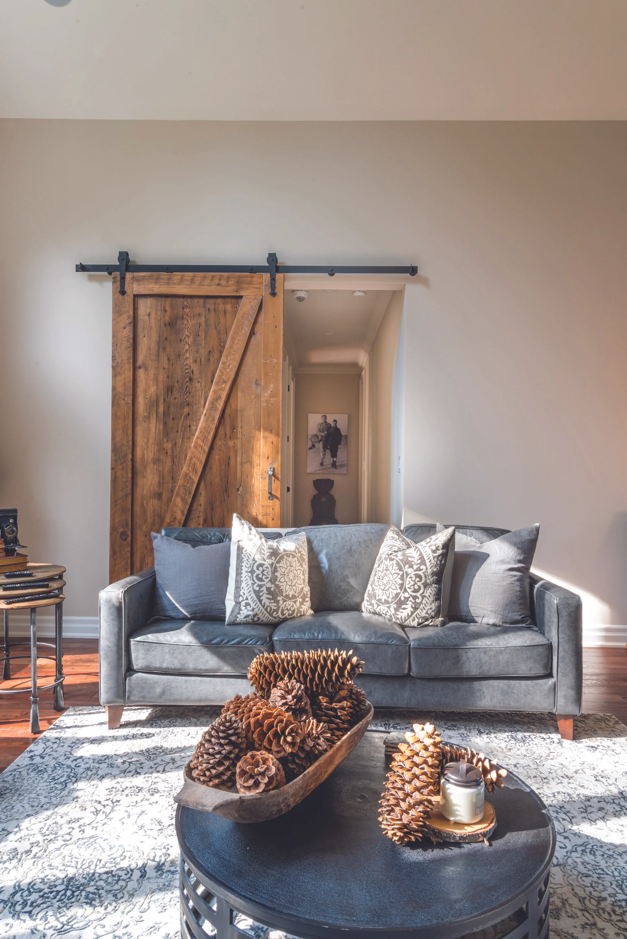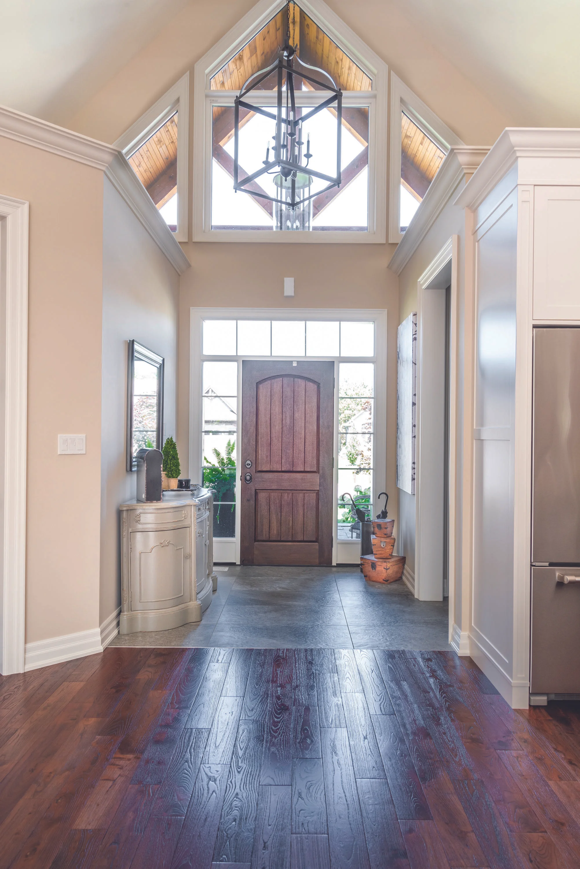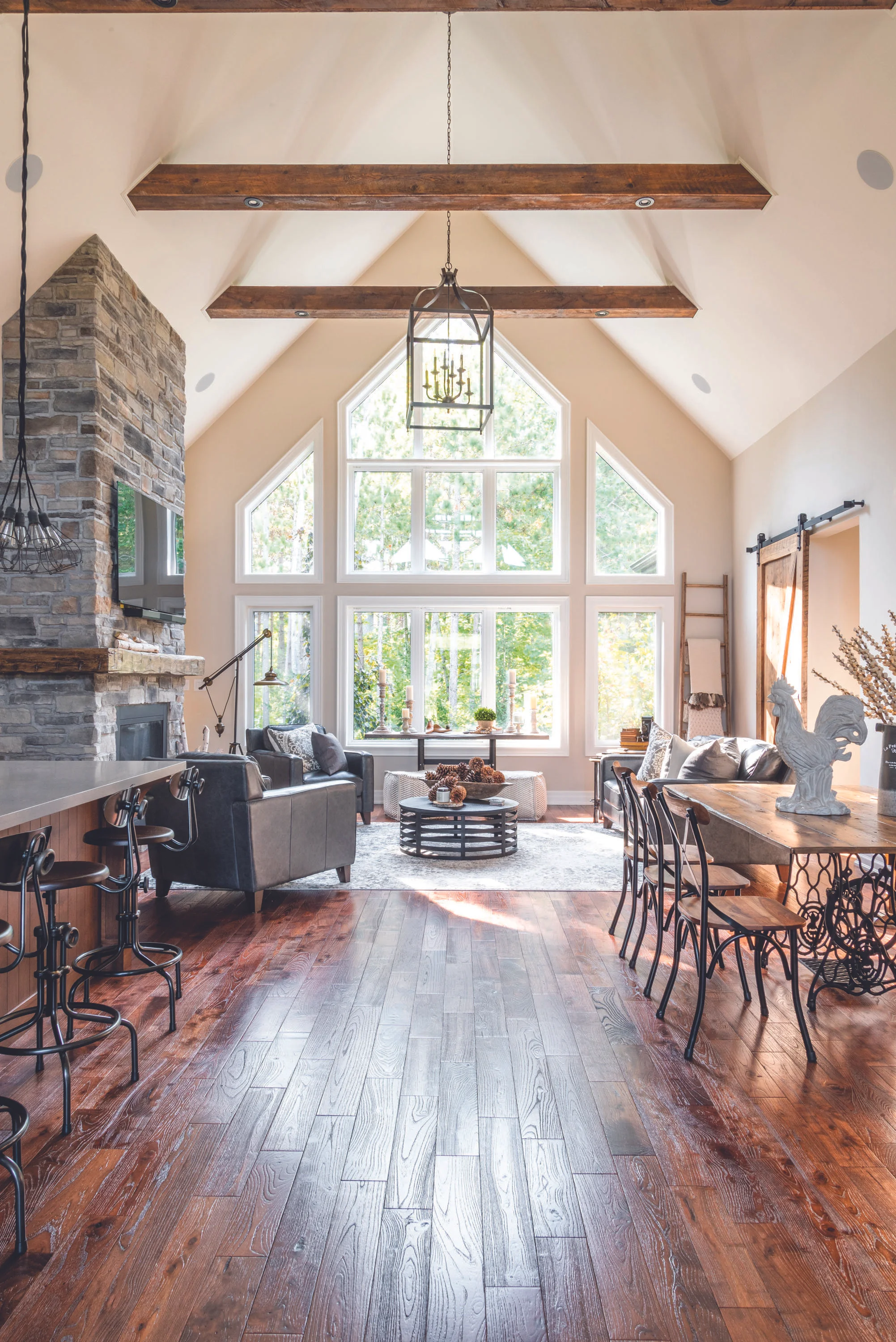Ryan Gradziel and Tyler Brown, co-owners of Oaklea Homes, helped Nick and Wendy achieve the balance between luxury finishes and rustic accents – including exposed beams from United Lumber Home Hardware Building Centre in the 22-foot vaulted ceiling, and the builders’ signature PineRidge Timberframe front facade. An oversize barn door with black hardware stands opposite the stone fireplace on the main floor, while an even larger version lends privacy to their son’s basement apartment below.
