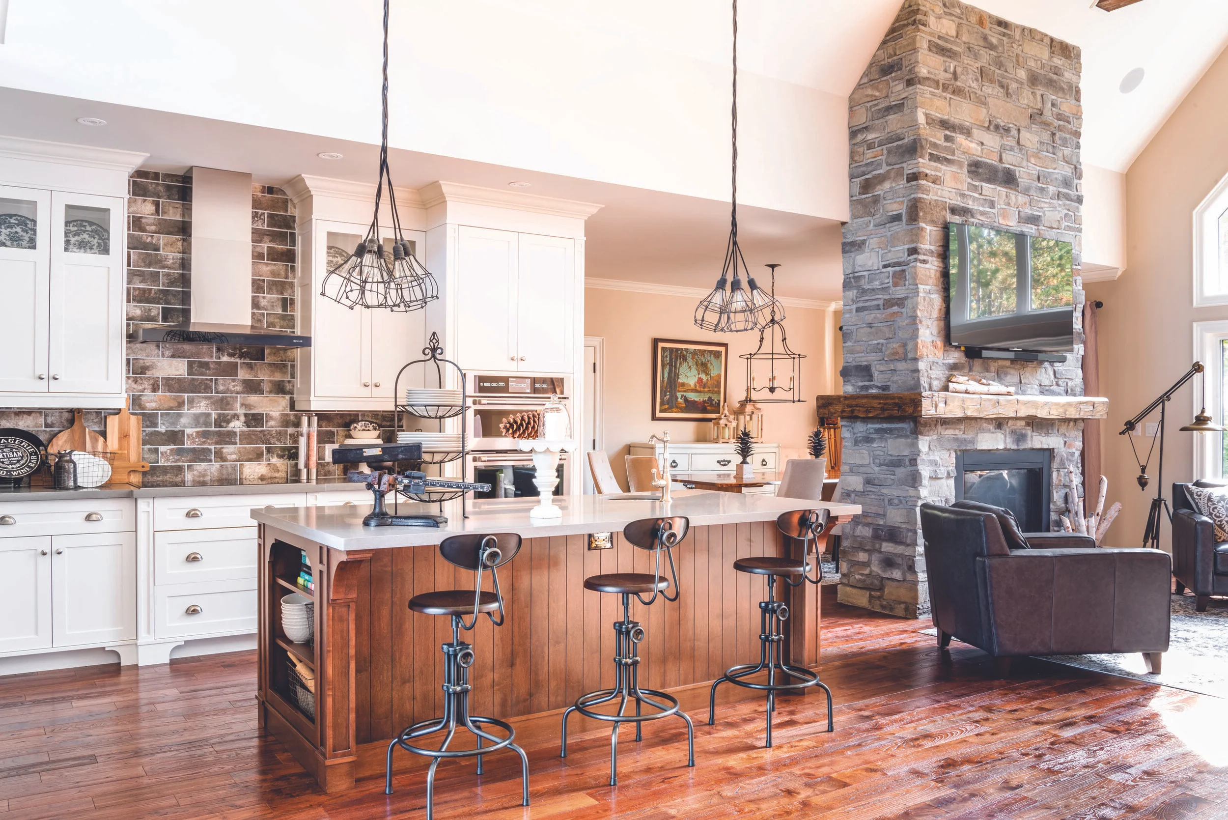 Inside the 2,300 sq. ft. bungalow, the love of the outdoors continues with Wendy’s modern farmhouse style providing a rustic elegance that incorporates many natural materials. For example, Barn to Table, known for its custom woodworking, handcrafted the dining and kitchen tables, as well as the hand-hewn mantel that wraps around the double-sided stone fireplace by Bailey Enterprises.