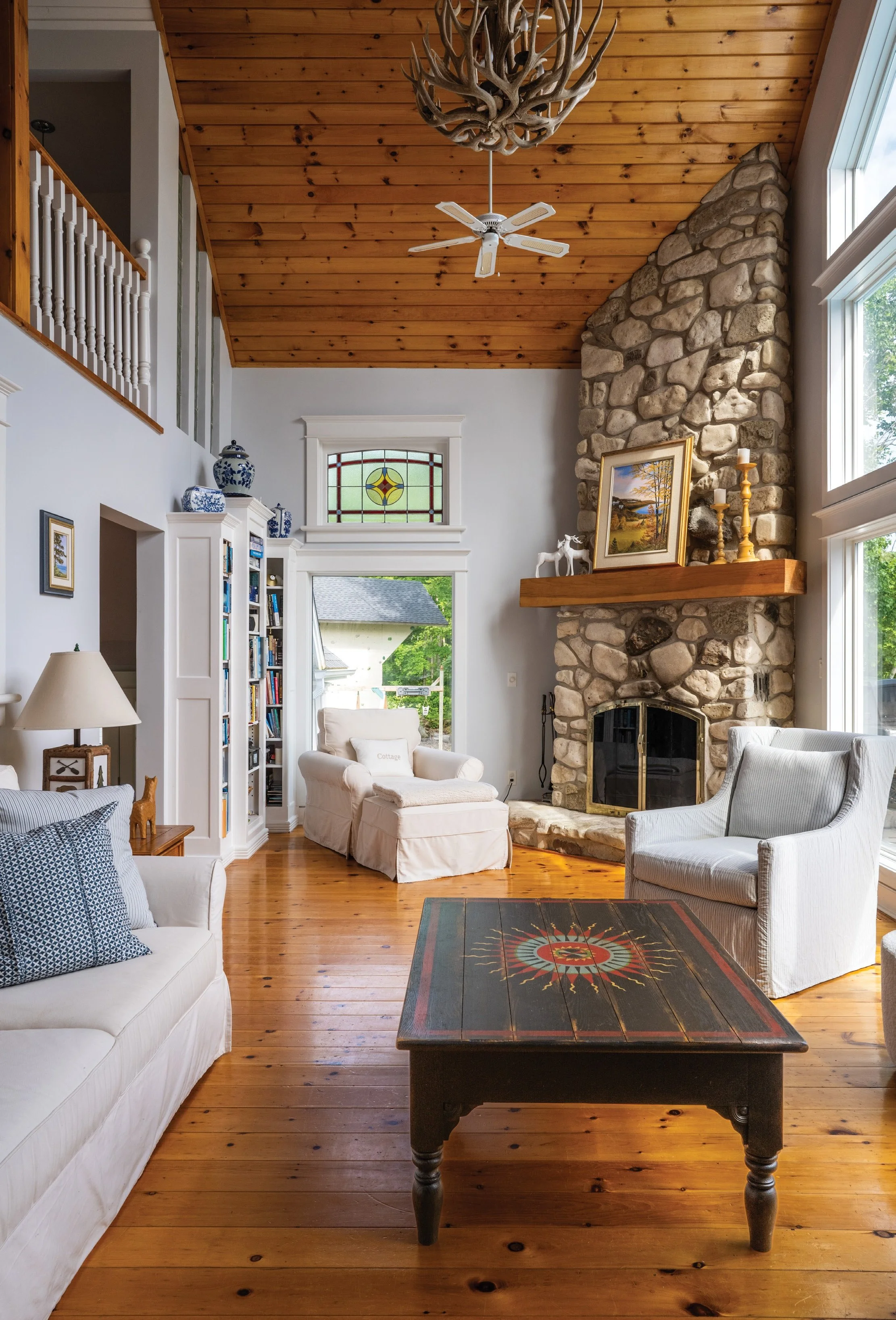 Upstairs, the primary suite brings the same balance of elegance and ease. Barn doors slide open to a calm, light-filled room with views of the trees. The en suite includes a freestanding soaker tub, rainfall shower with herringbone tile inlay and painted shiplap ceilings. Stained-glass windows tucked above doorways offer quiet moments of colour. Pieces of bubbled glass from the original cottage now sit above the upstairs landing, a keepsake of what came before.