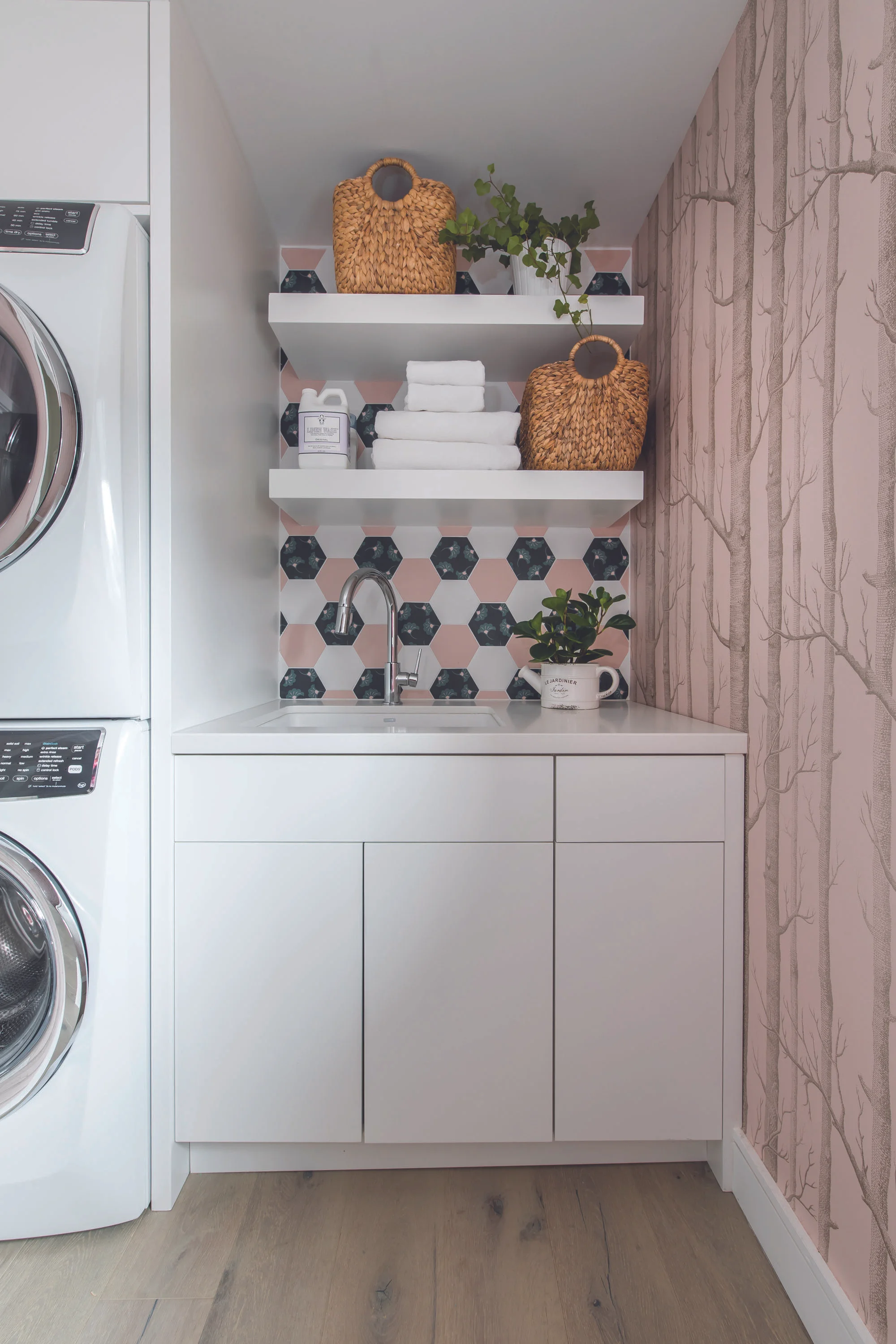 The new second floor configuration contains the kids’ rooms, a second office, bathroom and laundry room take up residence. “The laundry room is one of my favourite rooms. It has open shelving that exposes a fun hexagon wall tile done in blush pink, black and white,” says Anita. “The remaining walls are done with an enchanted forest-themed wallpaper in the same blush pink. It’s very whimsical but fresh with all the white cabinetry.”