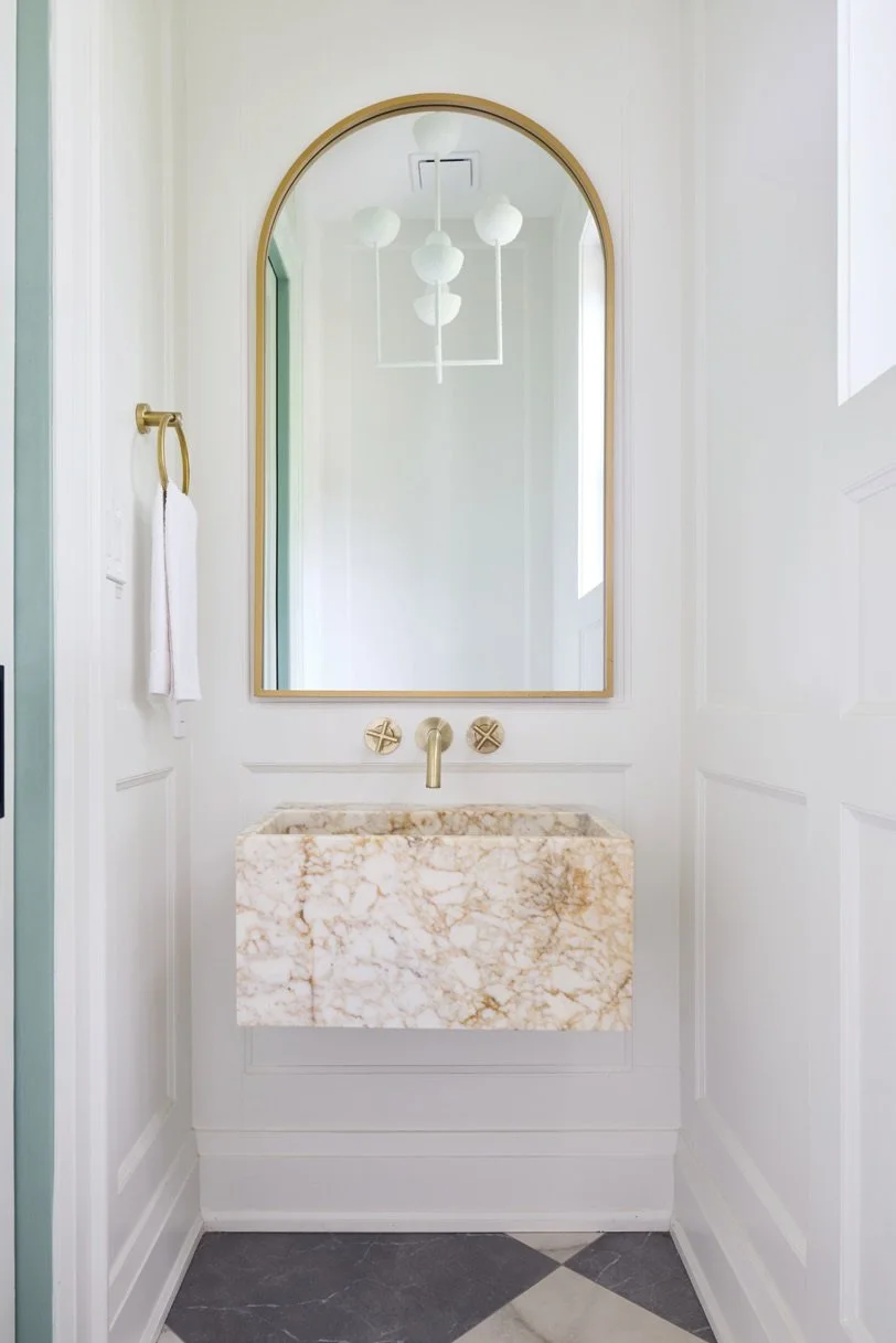 Bold, oversize lighting in mixed metals was purposely chosen to intentionally distinguish each space. “When you hit that eyeline, you want wow, not blank air,” says Elizabeth. “I personally think bigger is always better in terms of lighting, even in smaller spaces.”