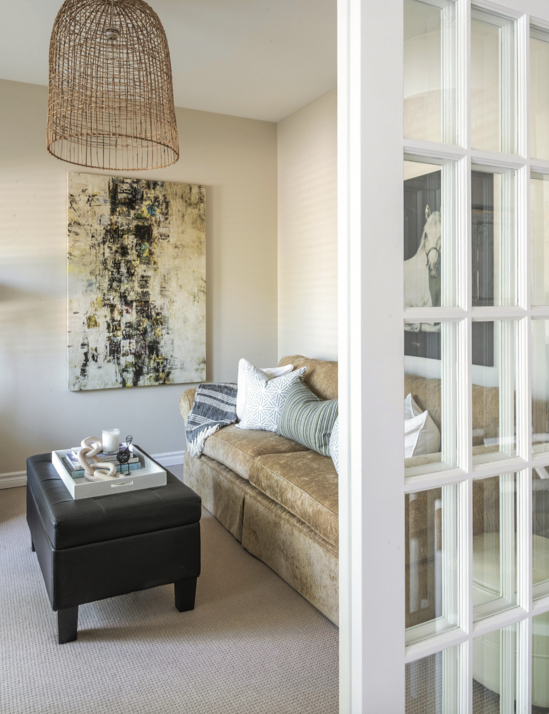 Lisa painted the main living areas on both levels Muslin by Benjamin Moore, a tranquil off-white that complements the neutral furnishings throughout the home.