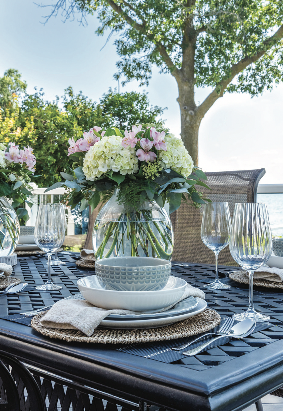 French doors along the entire back wall lead outside to the maintenance-free composite deck where Lisa has created three areas of escape – one for dining, another for sun-bathing and a place to lounge with family and friends – all beautifully styled with the latest accessory collections from Willow Lane Interiors.