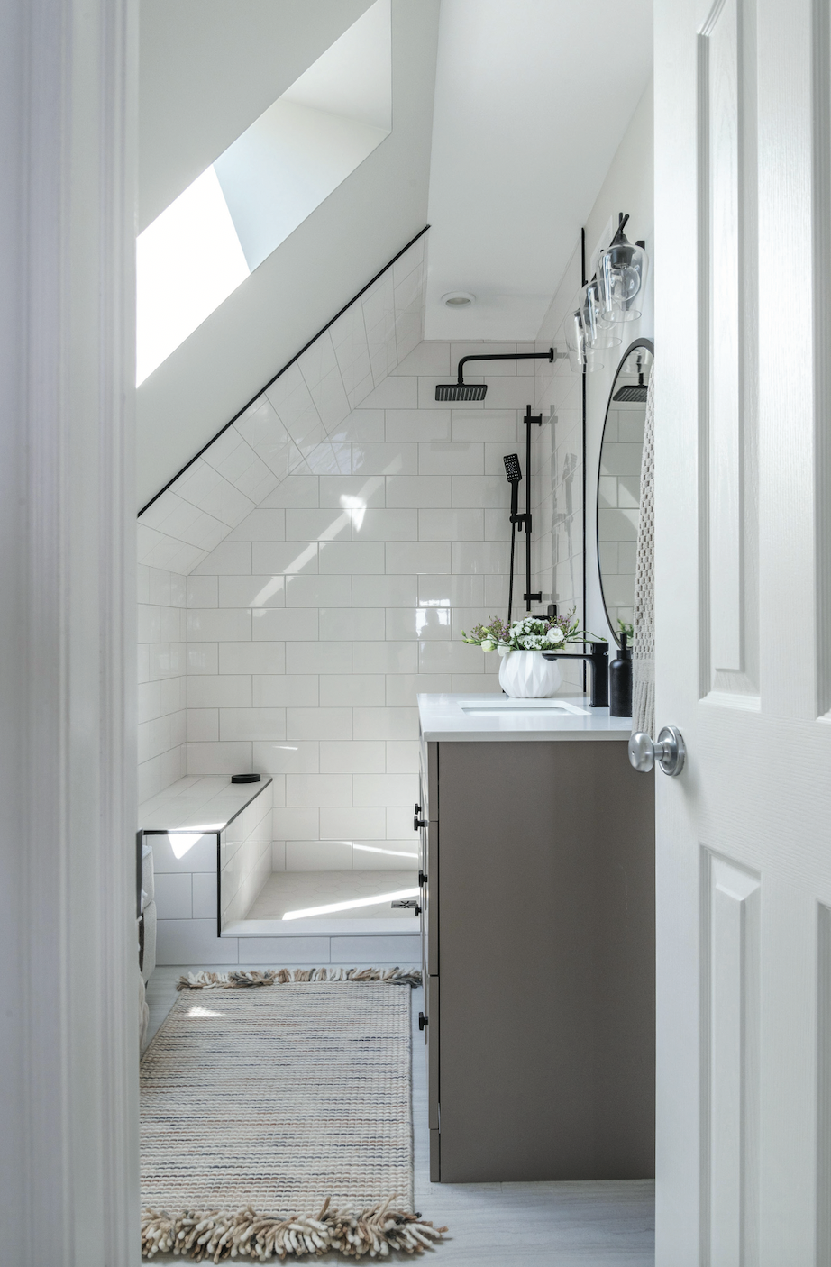 Their en suite is their latest project. In a scheme of black, white, grey and beige, it’s a timeless combination with fashionable touches, including a round mirror over a shaker-style, quartz-topped vanity and an upholstered bench. The black hardware and fixtures stand out while the skylight lets in the sunshine.