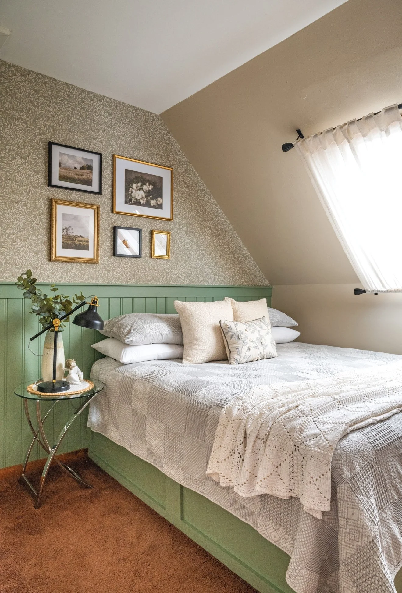The loft, added after the church closed, holds Julie’s bedroom. Perched high above the great room, this space takes advantage of the church’s soaring roofline, with angled ceilings that lend both drama and intimacy. While the main floor celebrates the church’s scale, this hideaway feels more personal – a compact nest, maximized with a seating area and softened with textiles.