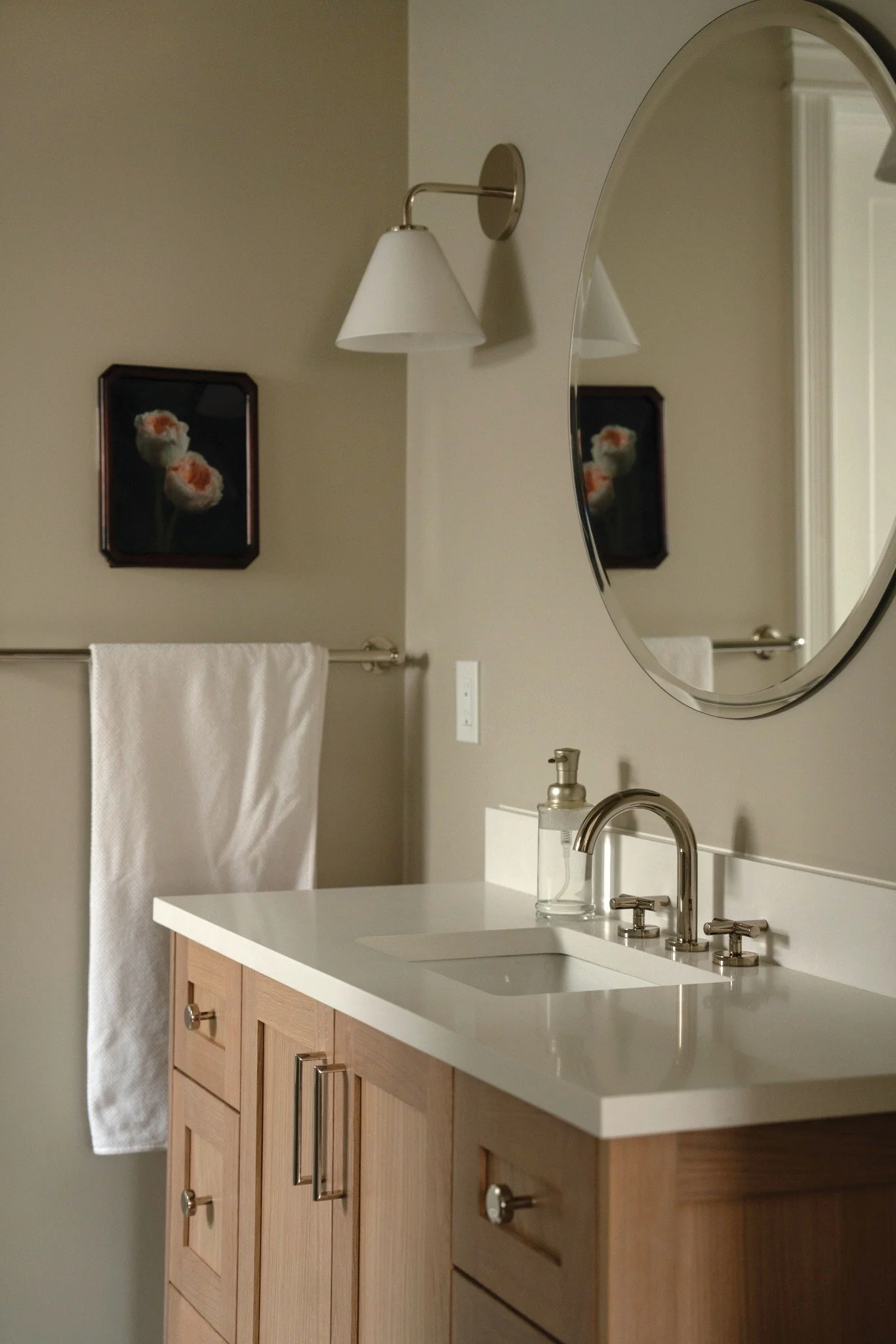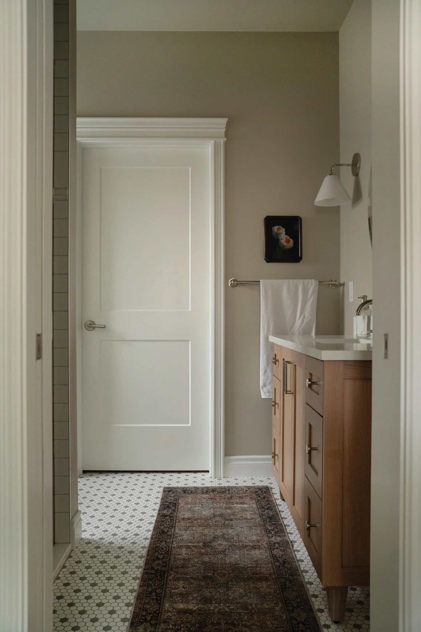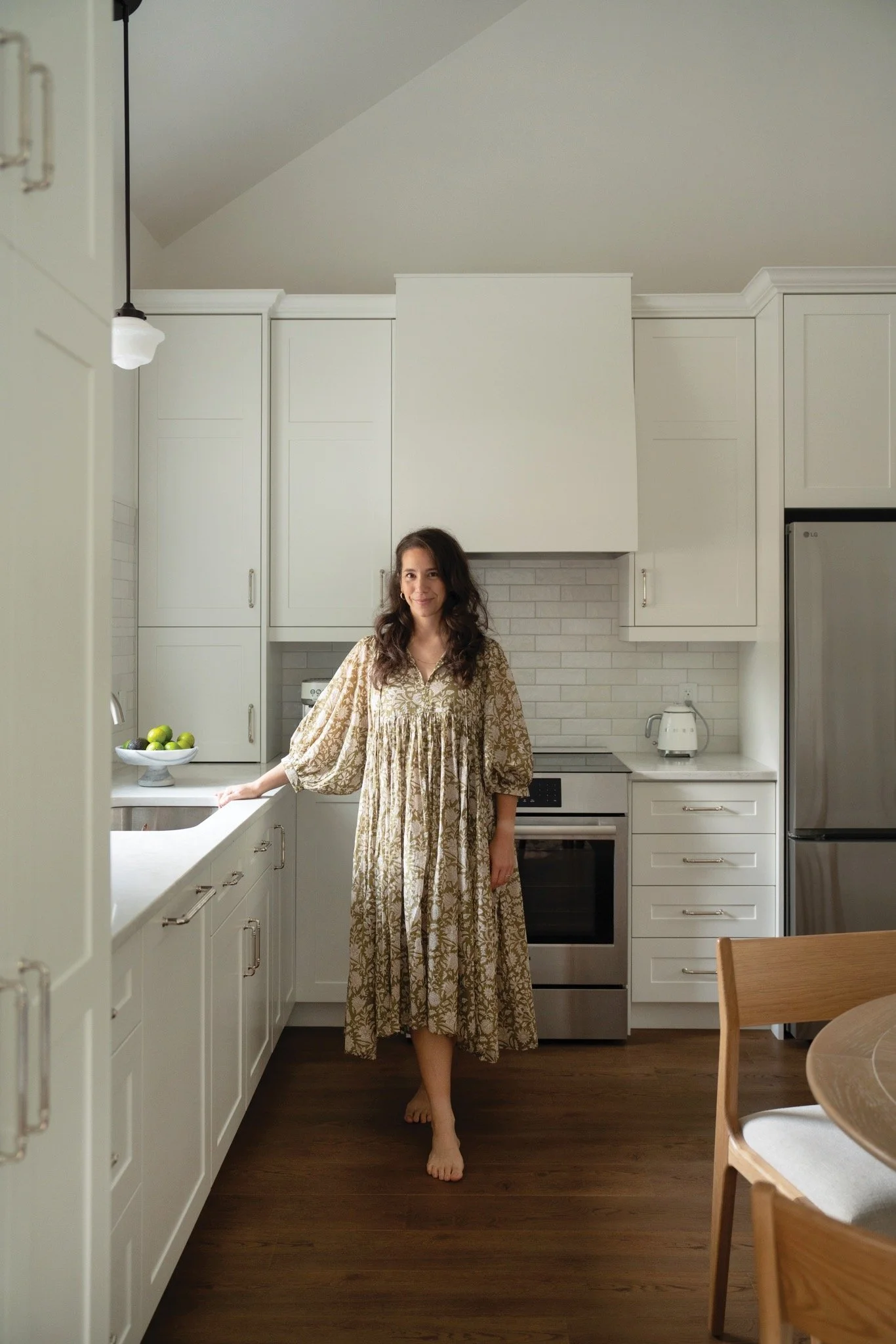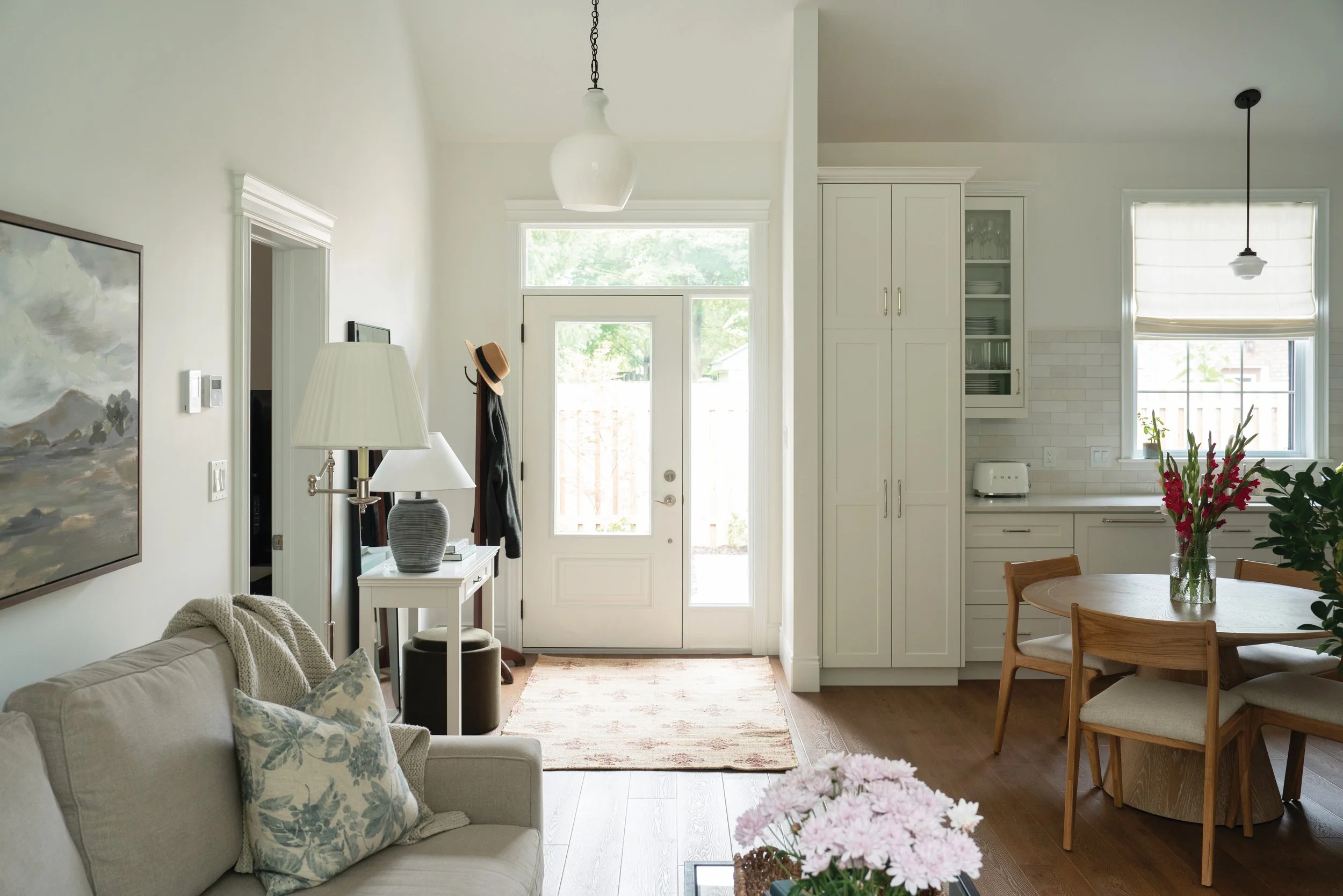 Inside, that sensibility reads as warmth rather than nostalgia. Underfoot, durable vinyl flooring runs continuously through the entry and main living spaces, enhancing flow and making the footprint feel larger. In the kitchen, with cabinetry crafted by Newlife Cabinetry, every inch was tailored to the way the homeowners live. A pull-out pantry saves space, while an appliance garage keeps daily-use items accessible yet visually quiet.