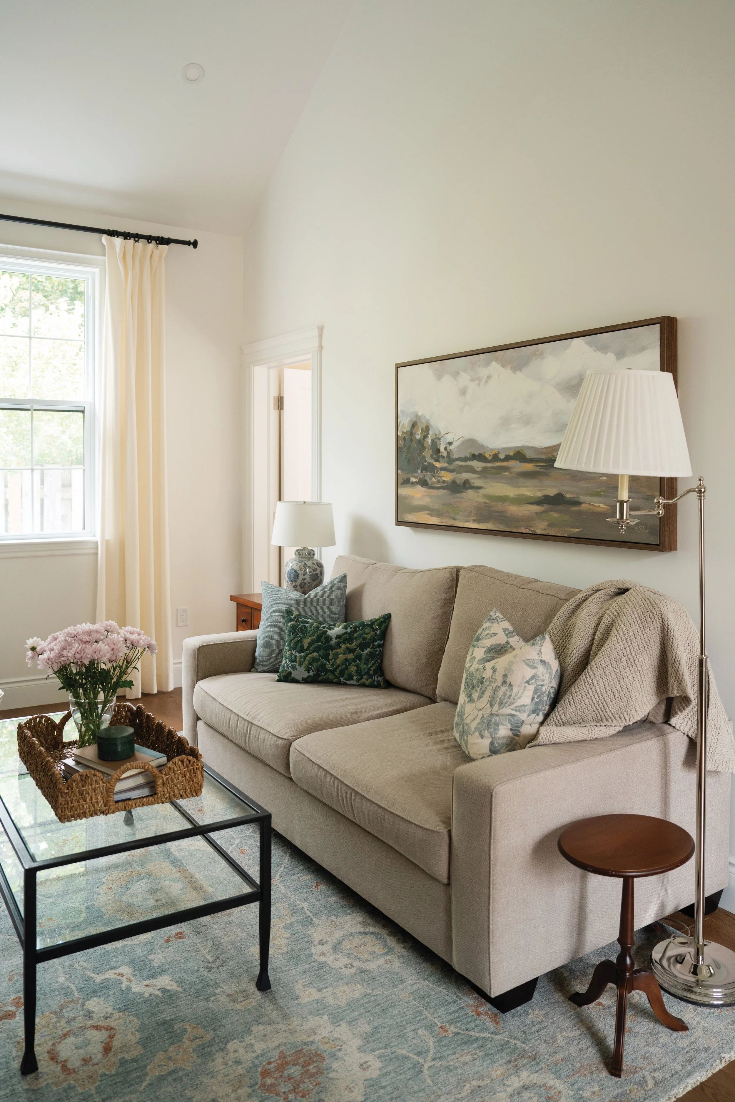 The living and dining area is comfortable yet elevated, with room for family gatherings and quieter moments. A full-size sofa faces the television, while an armchair sits by the window for reading. Layered lighting softens the space in the evenings.