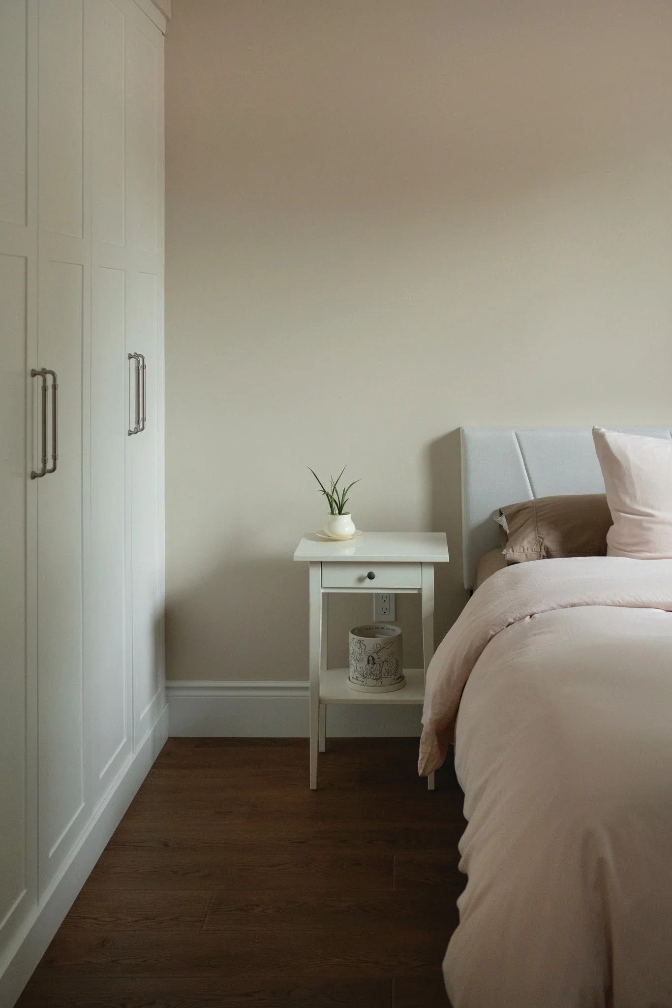 Both bedrooms comfortably fit king-size beds with nightstands, thanks to generous built-in closets and thoughtful layouts. Vaulted ceilings and oversize windows bring light deep into the rooms, making them feel bright and calm.