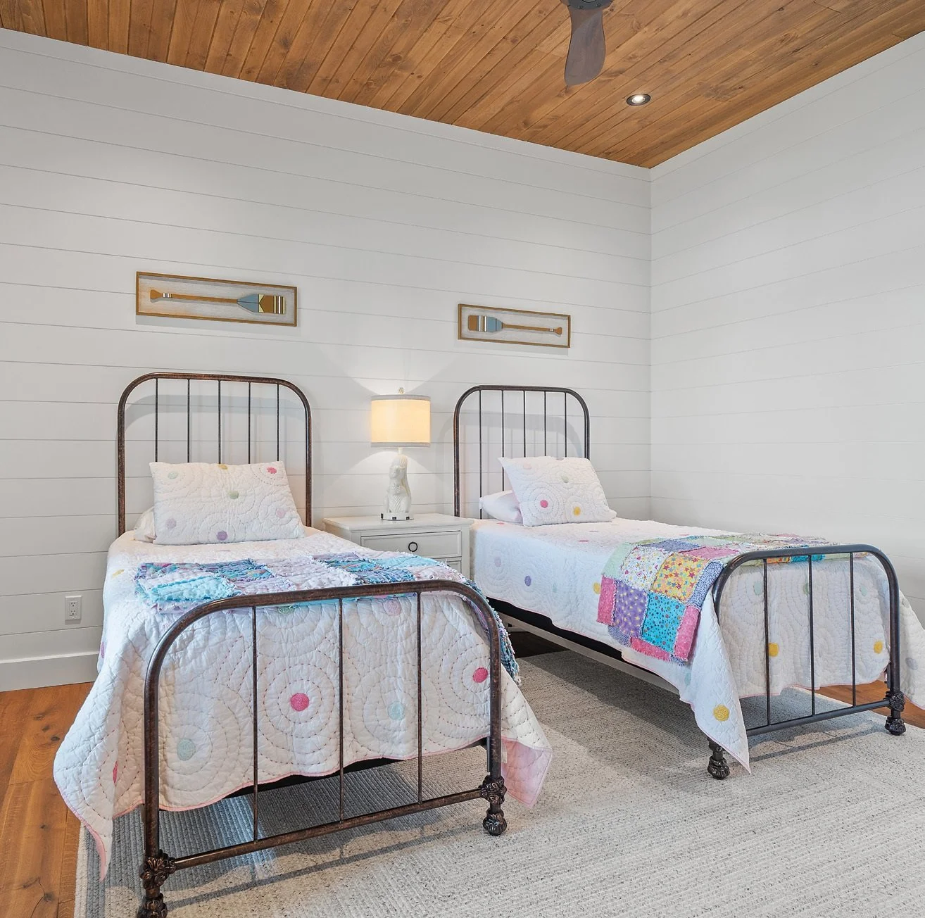 A charming Pan-Abode cedar cottage, built in 1969, with rustic, high ceilings and exposed beams, sat on the site. “It was very old school, but cute and adorable,” Leeann says. However, as their family grew, the 900-square-foot cottage eventually felt cramped. “We are a family of five, and we were living on top of each other,” she says. When bats and carpenter ants moved in, the couple knew it was time to say goodbye to their beloved cottage and build a new, spacious summer home.