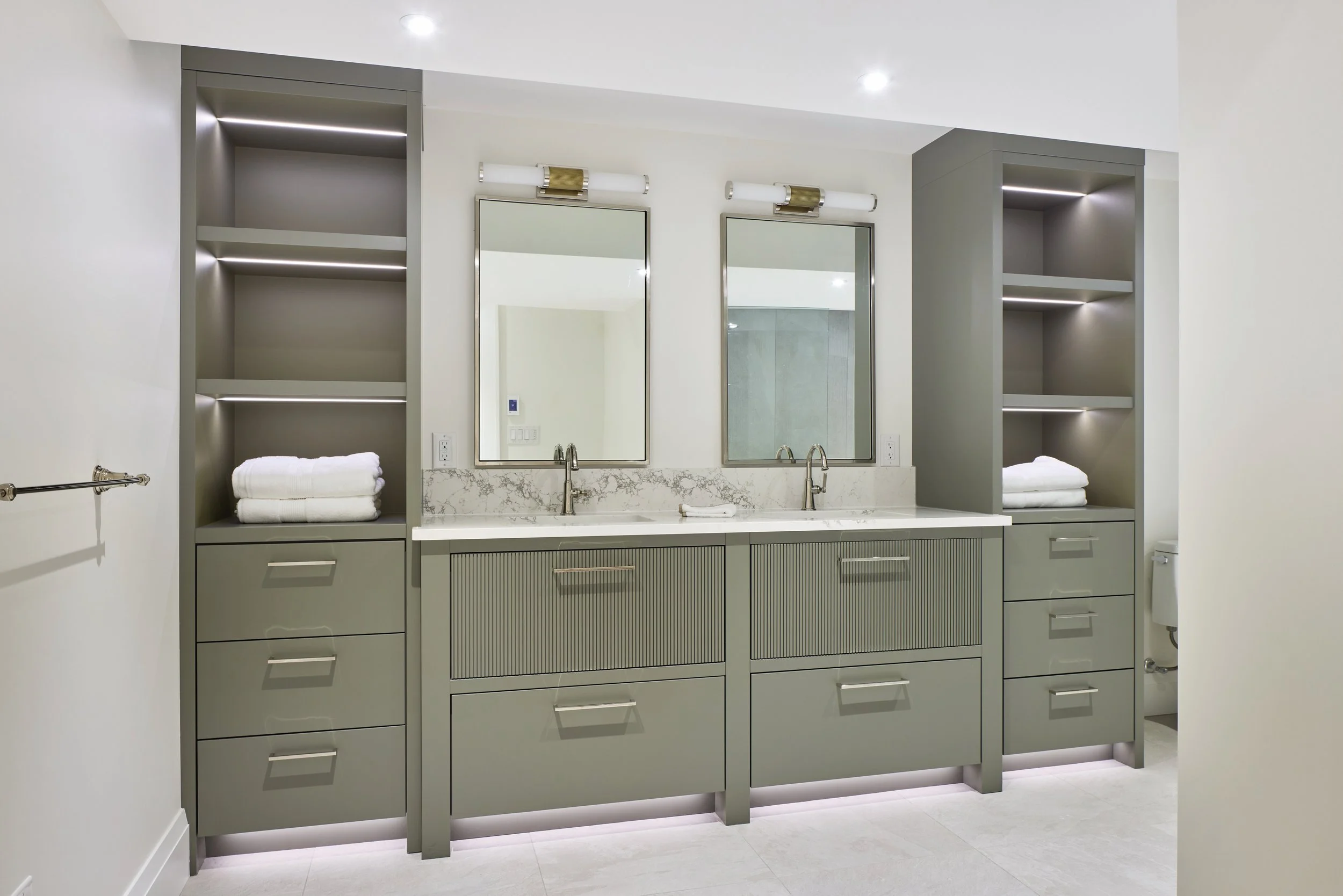 Under-cabinet lighting elevates both form and function, adding depth and ambience while making everyday tasks easier. Custom cabinetry and millwork play a starring role throughout the home, all crafted by Silverbirch Cabinetry & Millwork. From bathroom vanities to fireplace surrounds, wardrobes and built-ins, the detailing is consistent, intentional and impeccably executed.