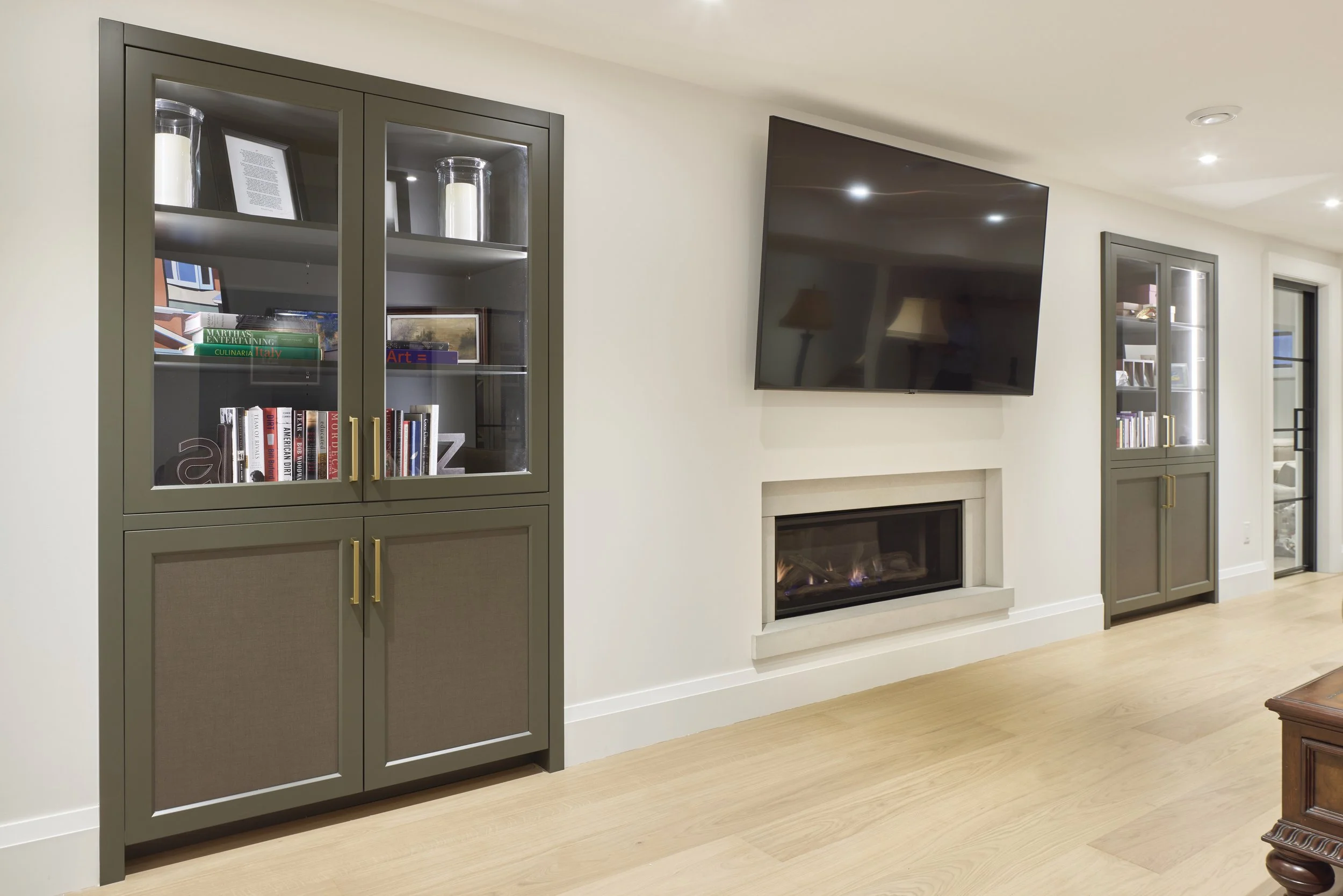 The homeowners value the ambience that fireplaces provide. Ridgeline upgraded the existing central living room fireplace with a custom plaster finish and added a second fireplace off the kitchen with surrounding custom built-ins and installed a third to warm the basement – all from Distinctive Fires.