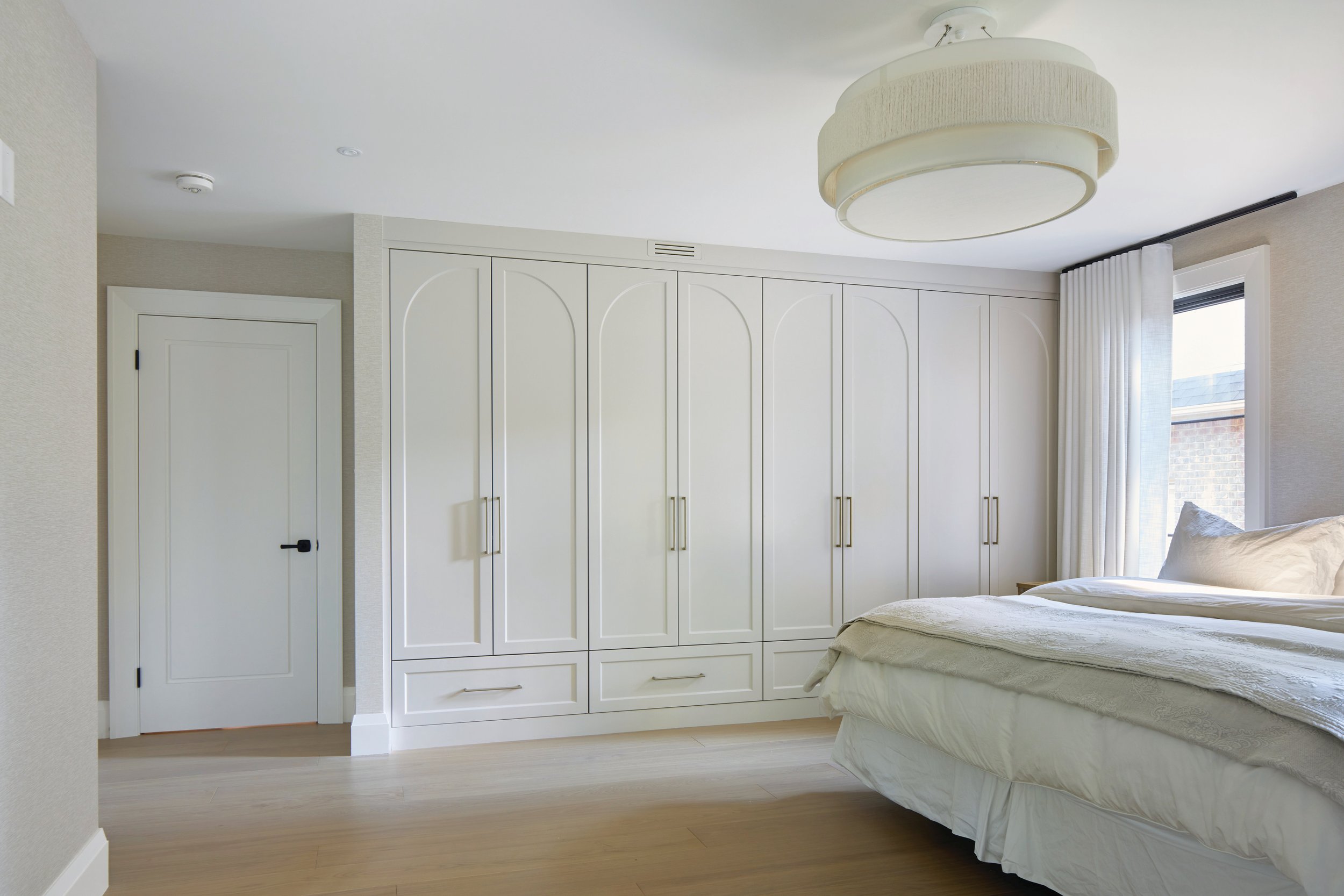 In the primary bedroom, a need to save space led to a creative solution: custom wardrobes instead of a typical walk-in closet.