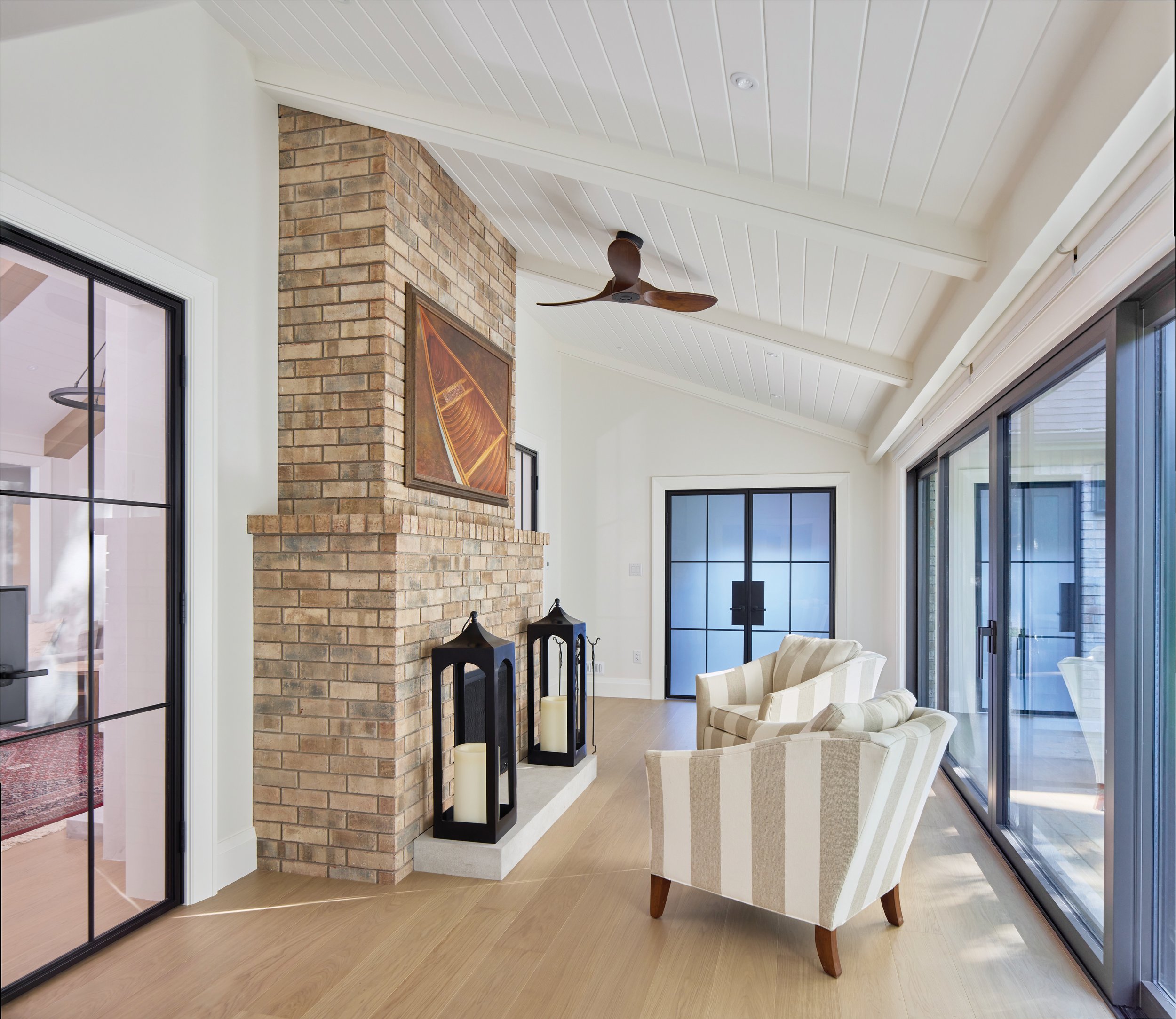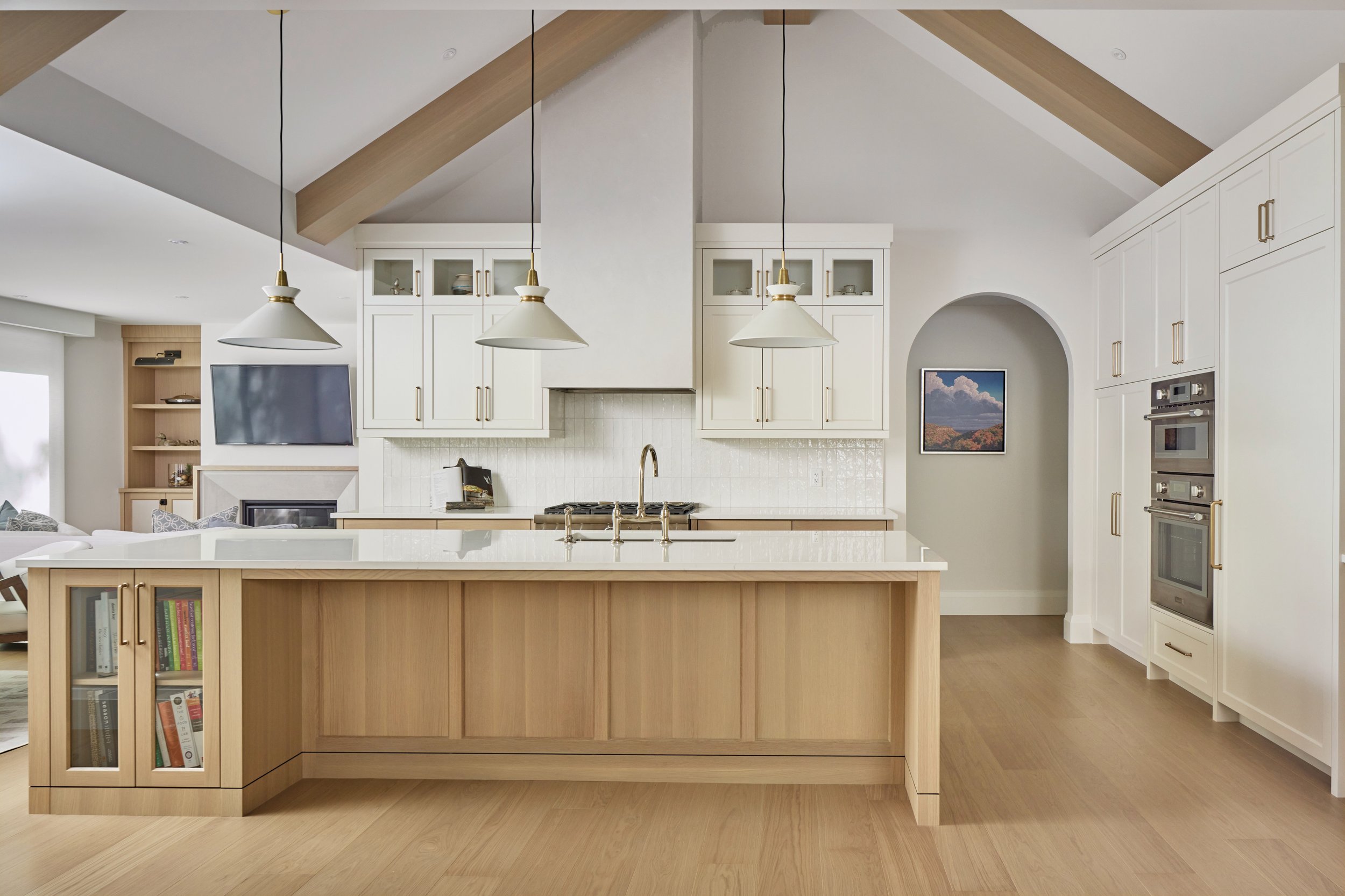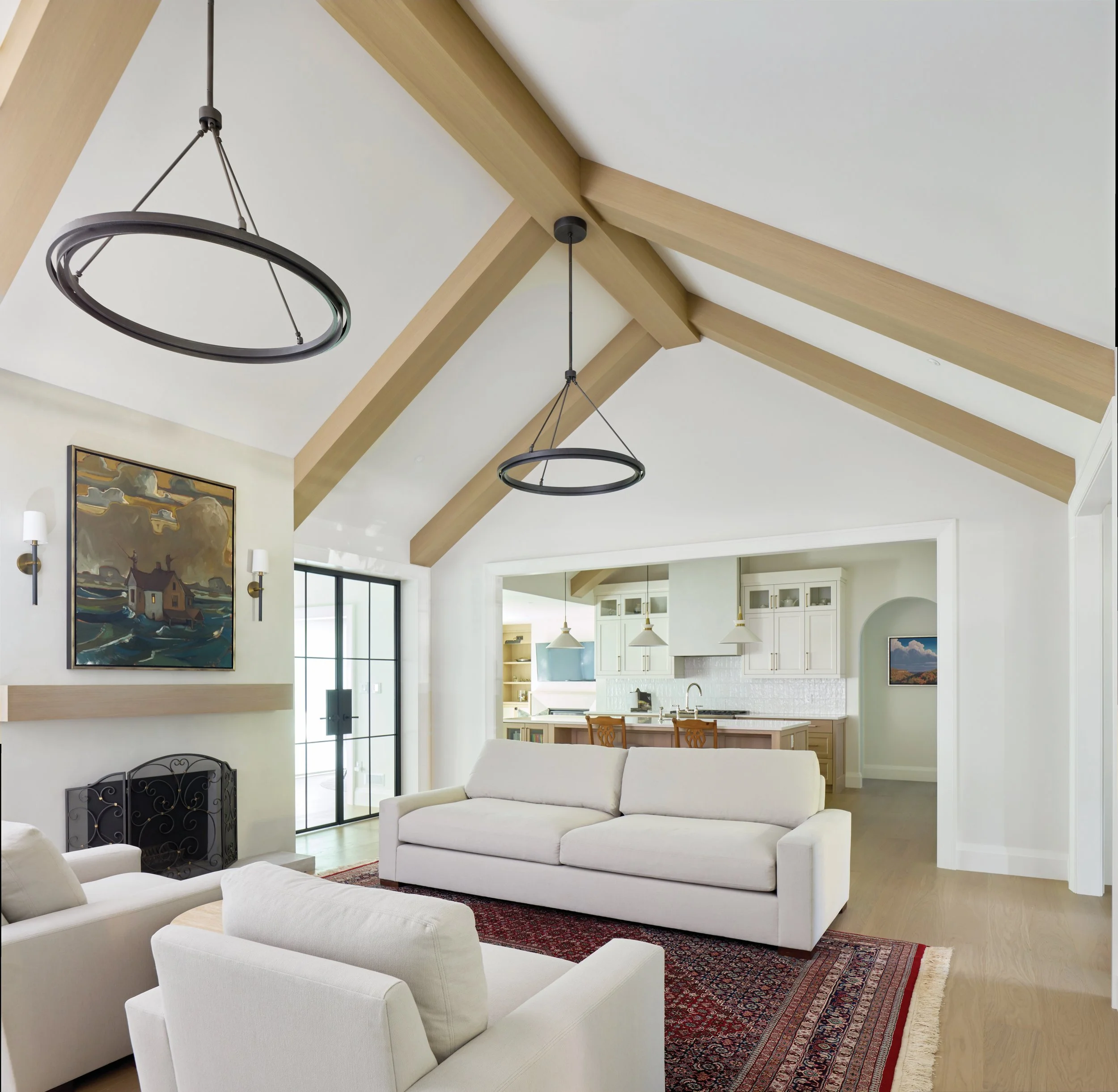 One of the most dramatic changes happened on the main floor, where walls were removed to create a light-filled living space. The addition of white oak wood beams to the vaulted ceilings brings warmth and architectural definition, preventing the space from feeling too cavernous while subtly lowering the visual height of the ceiling.