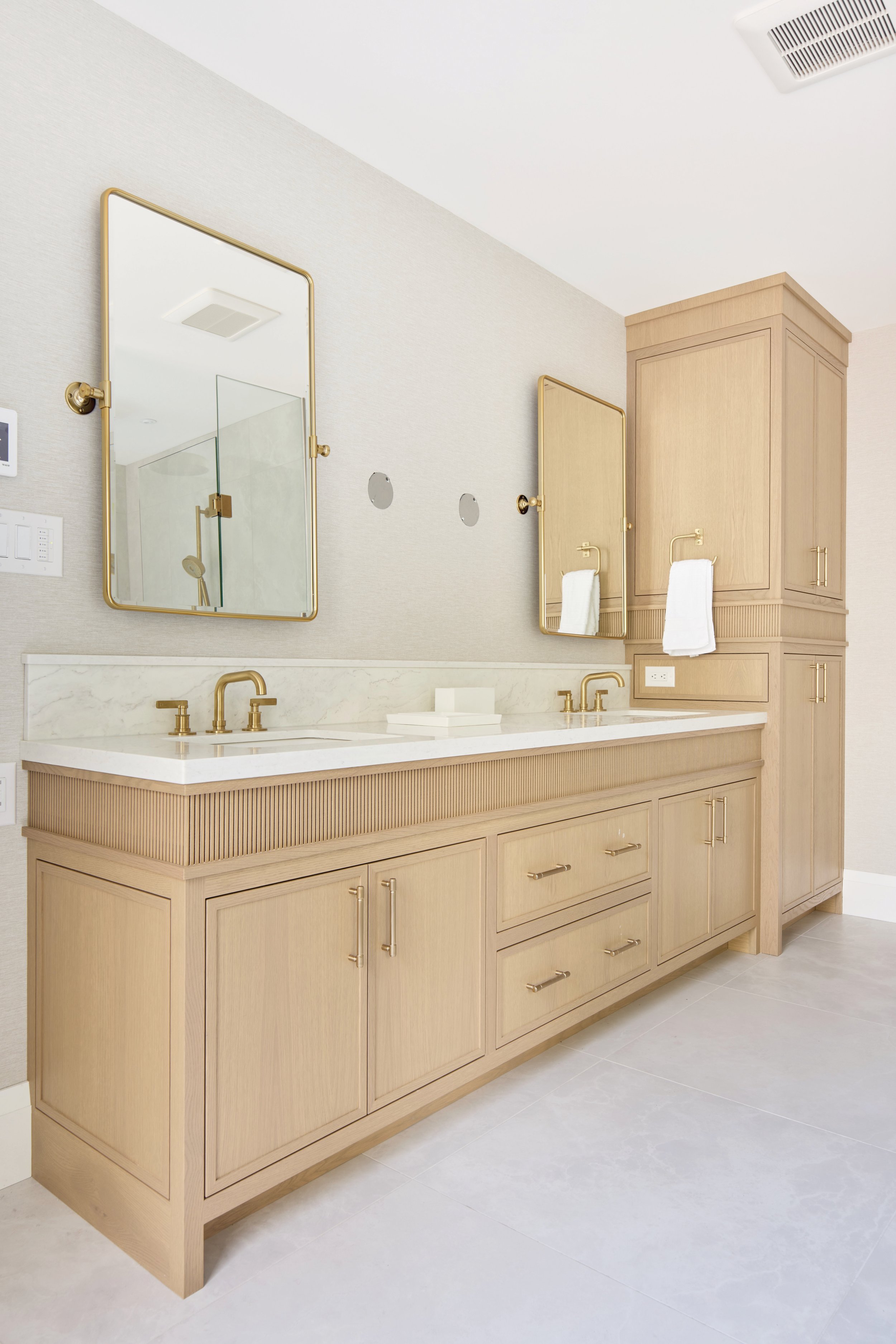 Rather than opting for stark white cabinetry, the design leans into warm wood tones to balance the neutral palette. “White-on-white can feel cold,” Rob notes. “The contrast of white cabinetry with the wood tone of white oak introduces warmth while maintaining a calm, refined feel.”
