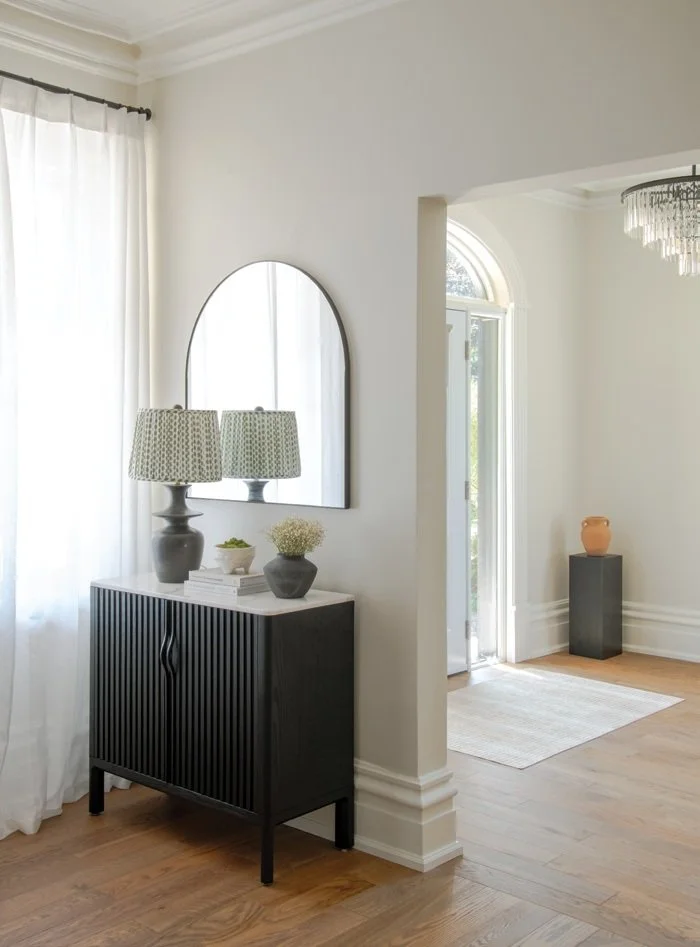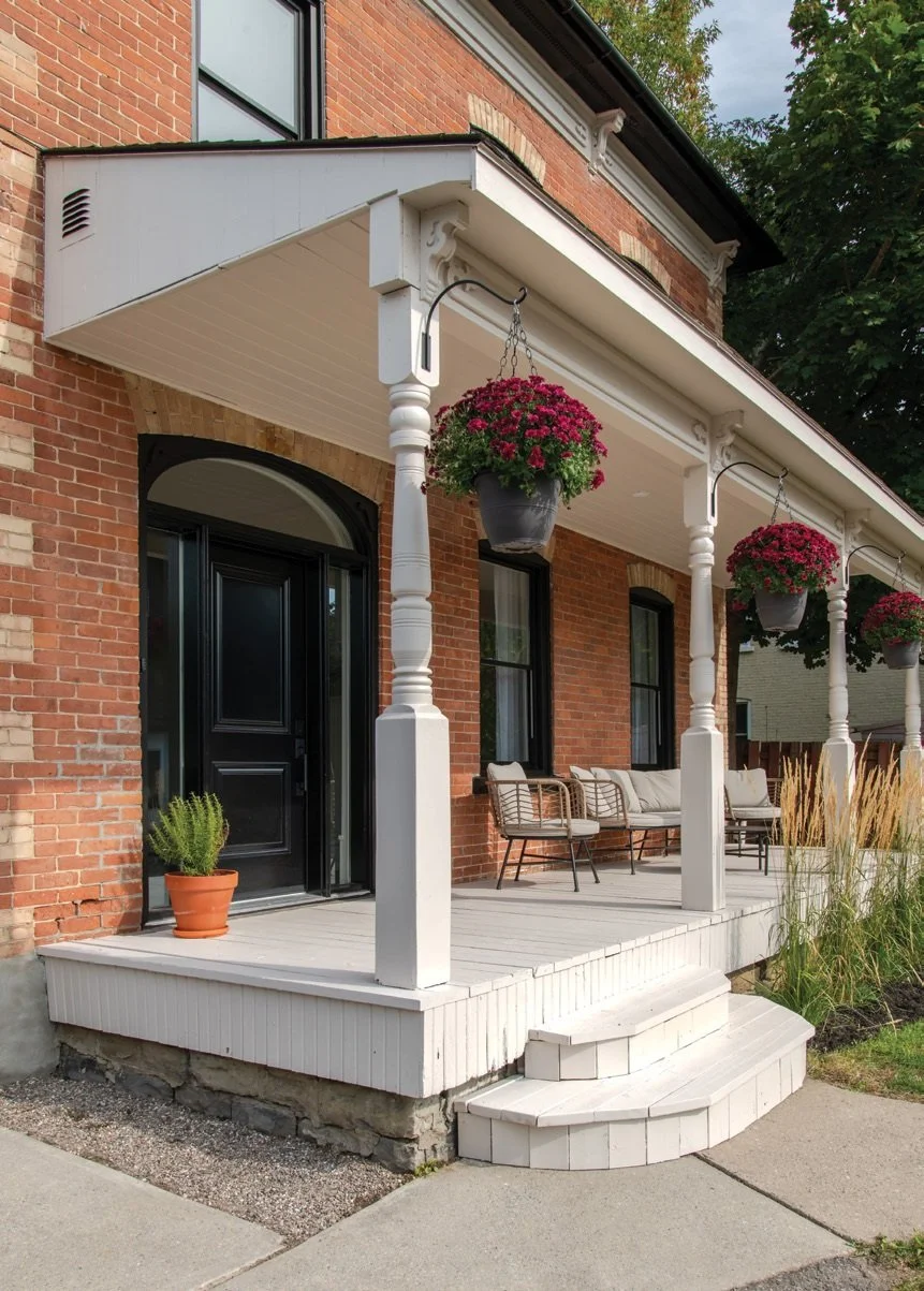 They started outside. “We painted the window frames and front porch, added the hanging baskets (Dovetails and Lavender) and a new front door with sidelights from EuroStar Windows and Doors,” says Lindsay, noting that the arched window at the top of the door was original to the home.
