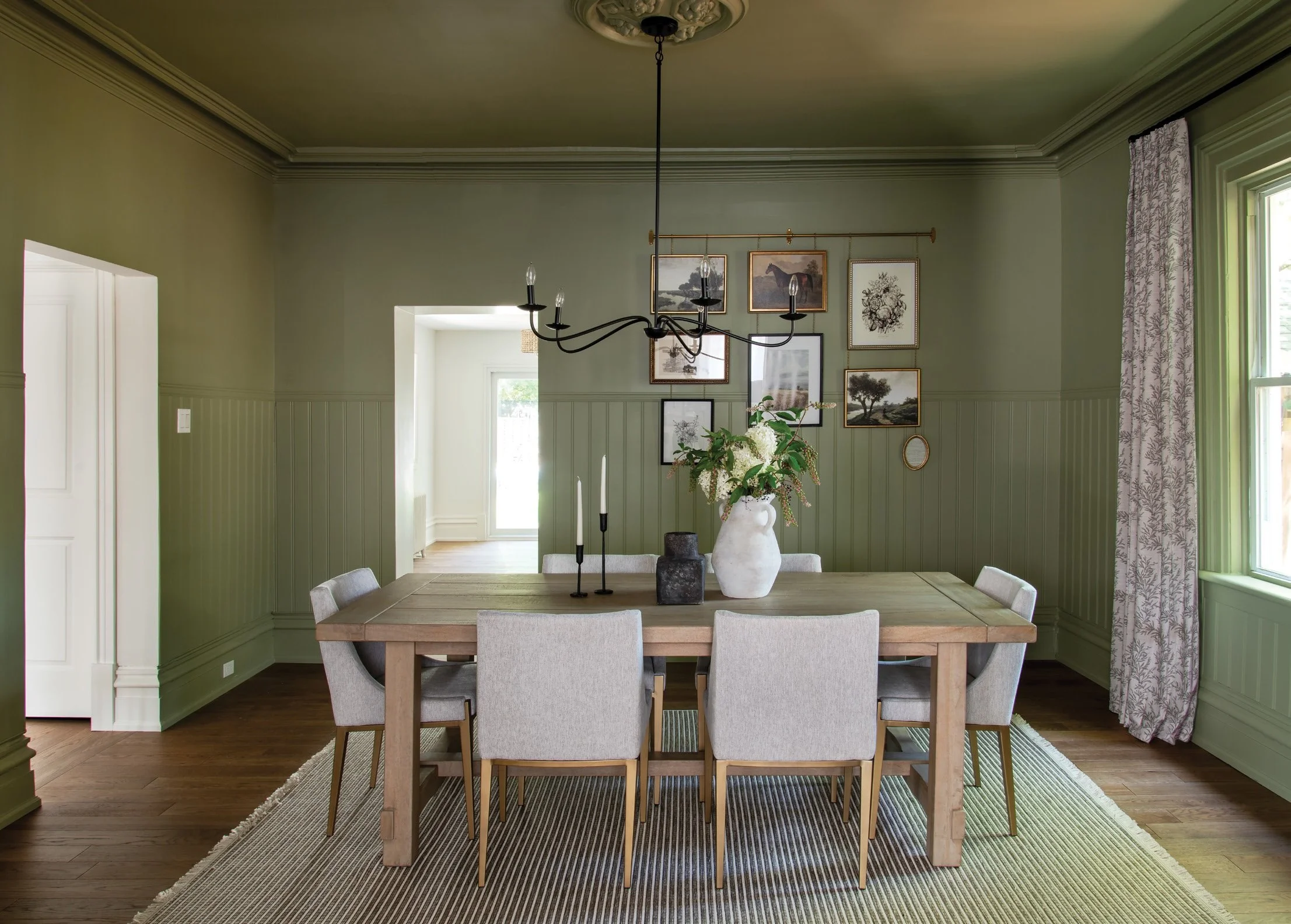 Overall, the home is a lovely balance of old and new. On-trend colour drenching in a rich green, Benjamin Moore Lilypad sourced at Randall’s, envelops the dining room, with a farmhouse-style light fixture that feels slightly industrial. Original ceiling medallions hint at the home’s history.