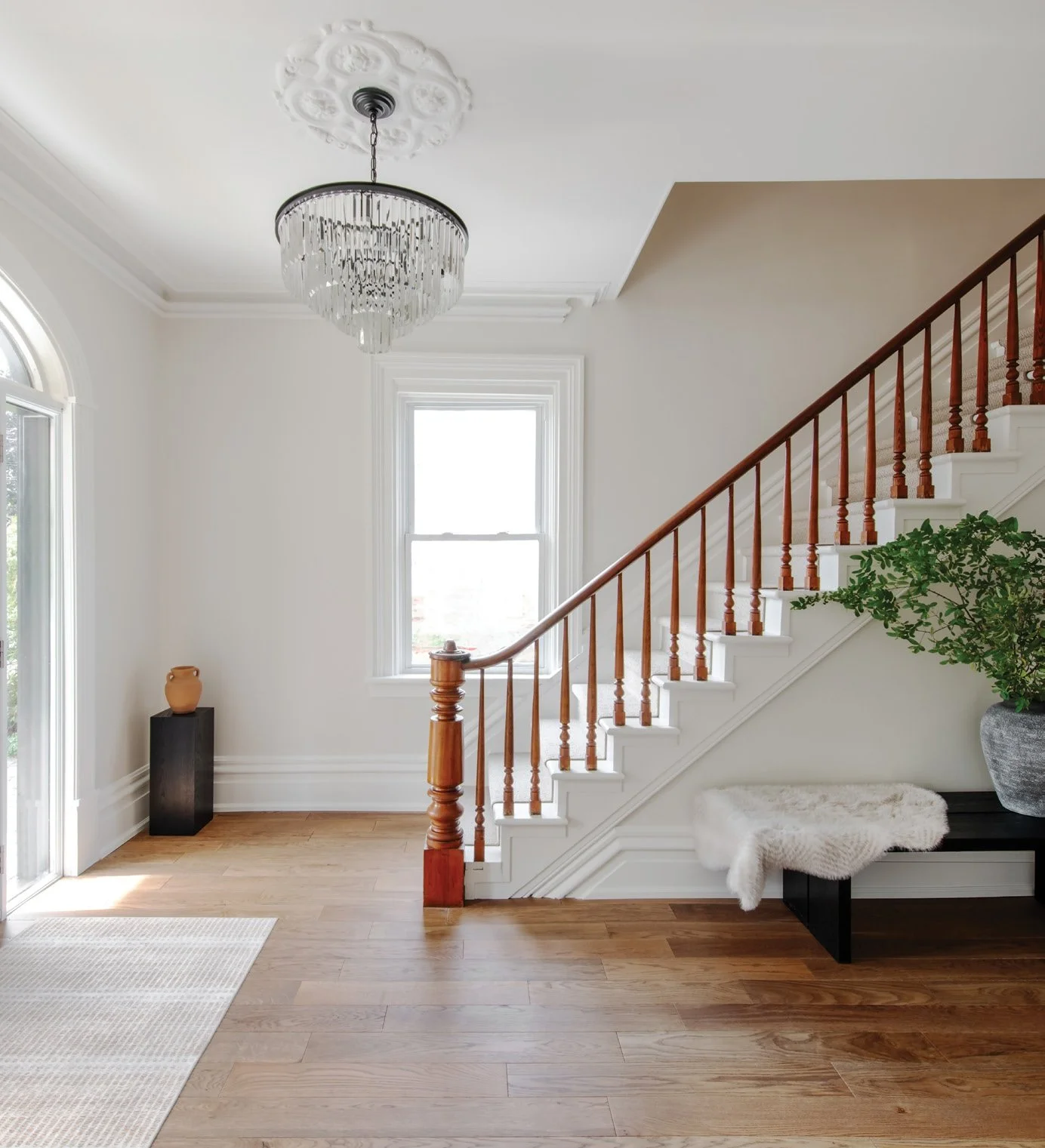The remaining staircase is now a stunning focal point in the foyer – a suitably grand entrance to this elegant home. To add warmth to the entryway, a staircase runner from Carpet Sense was added.